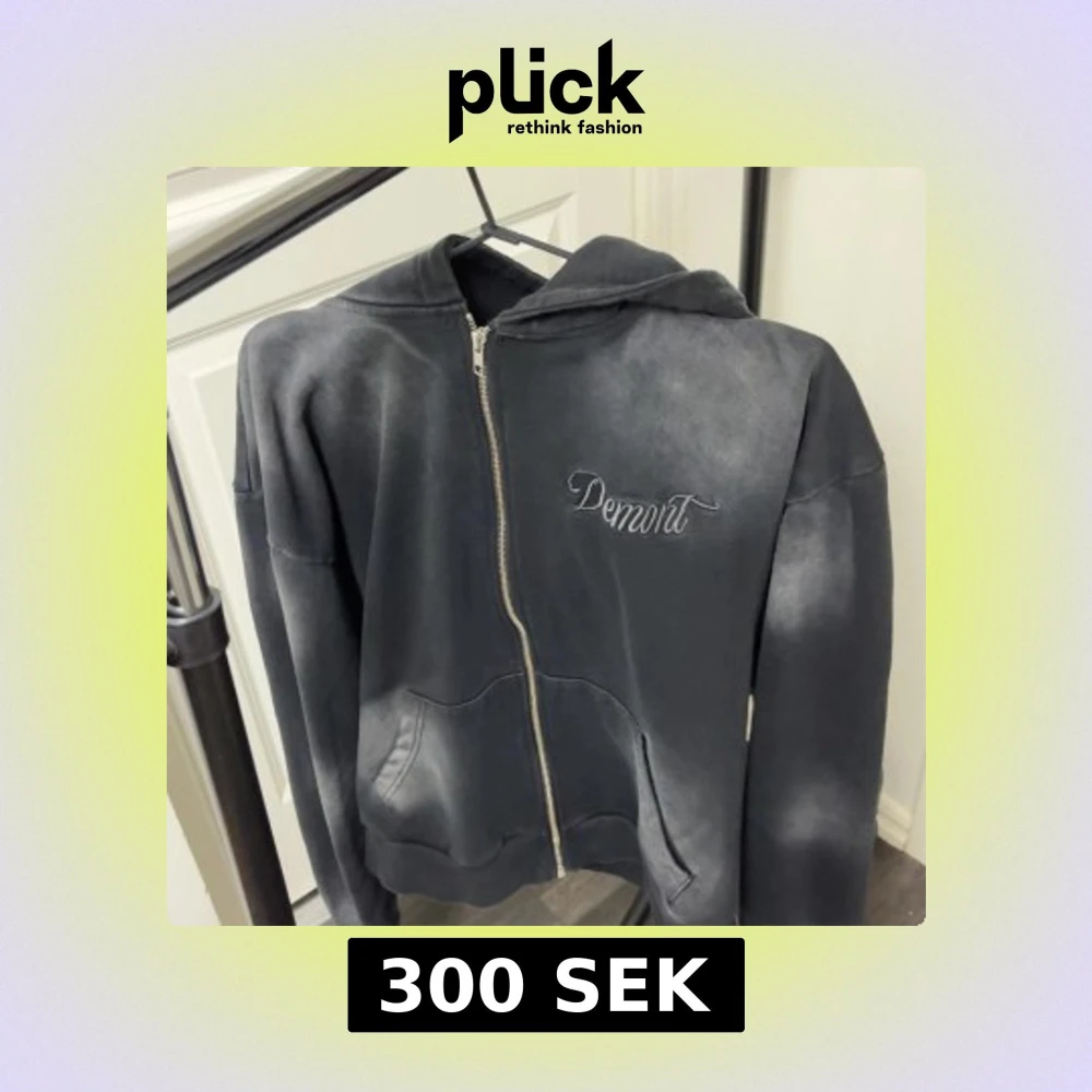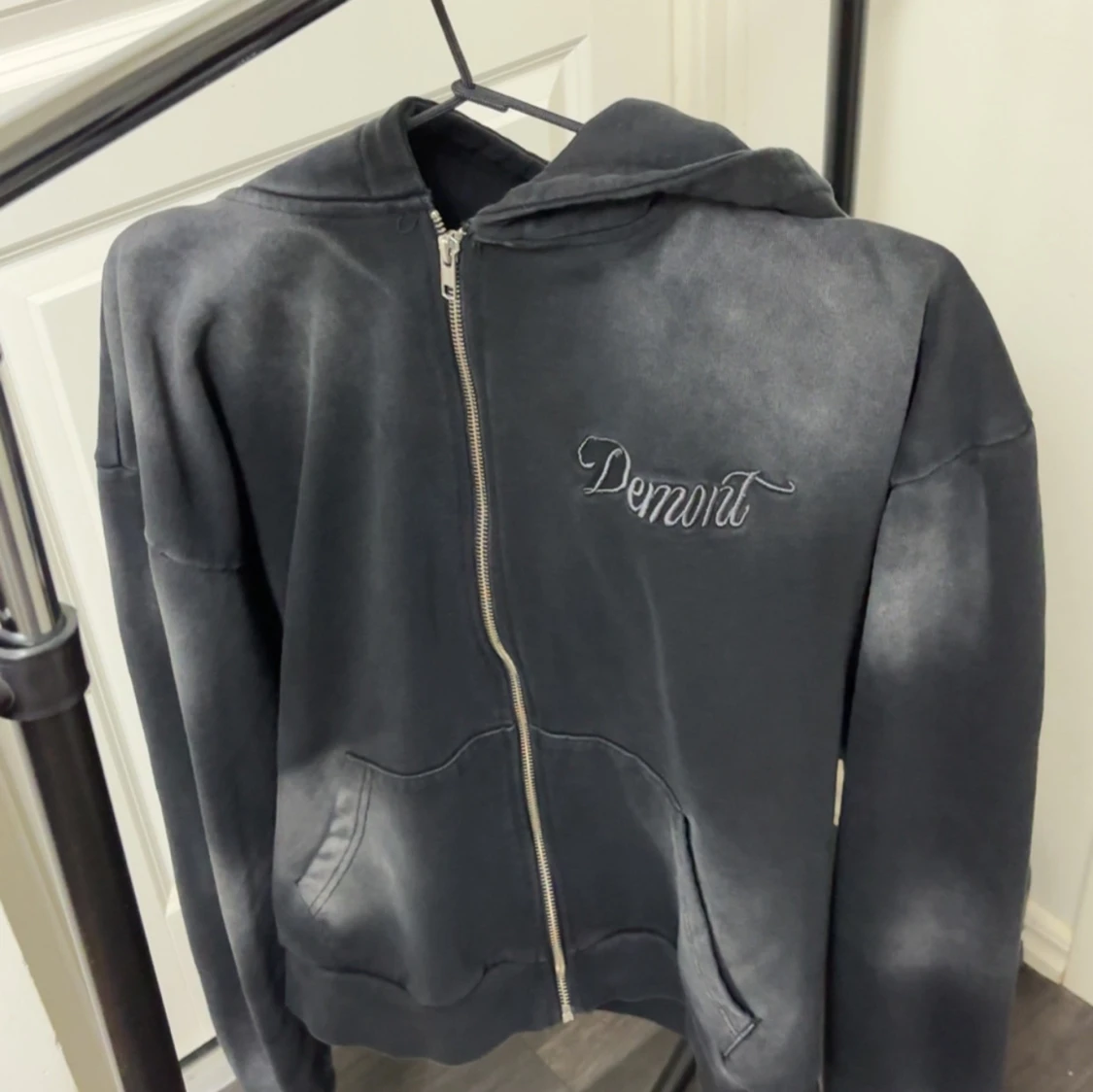 Cool svart hoodie från Demont med dragkedja framtill och broderad logga på bröstet. Tröjan har huva och två fickor framtill. Perfekt för en avslappnad stil.