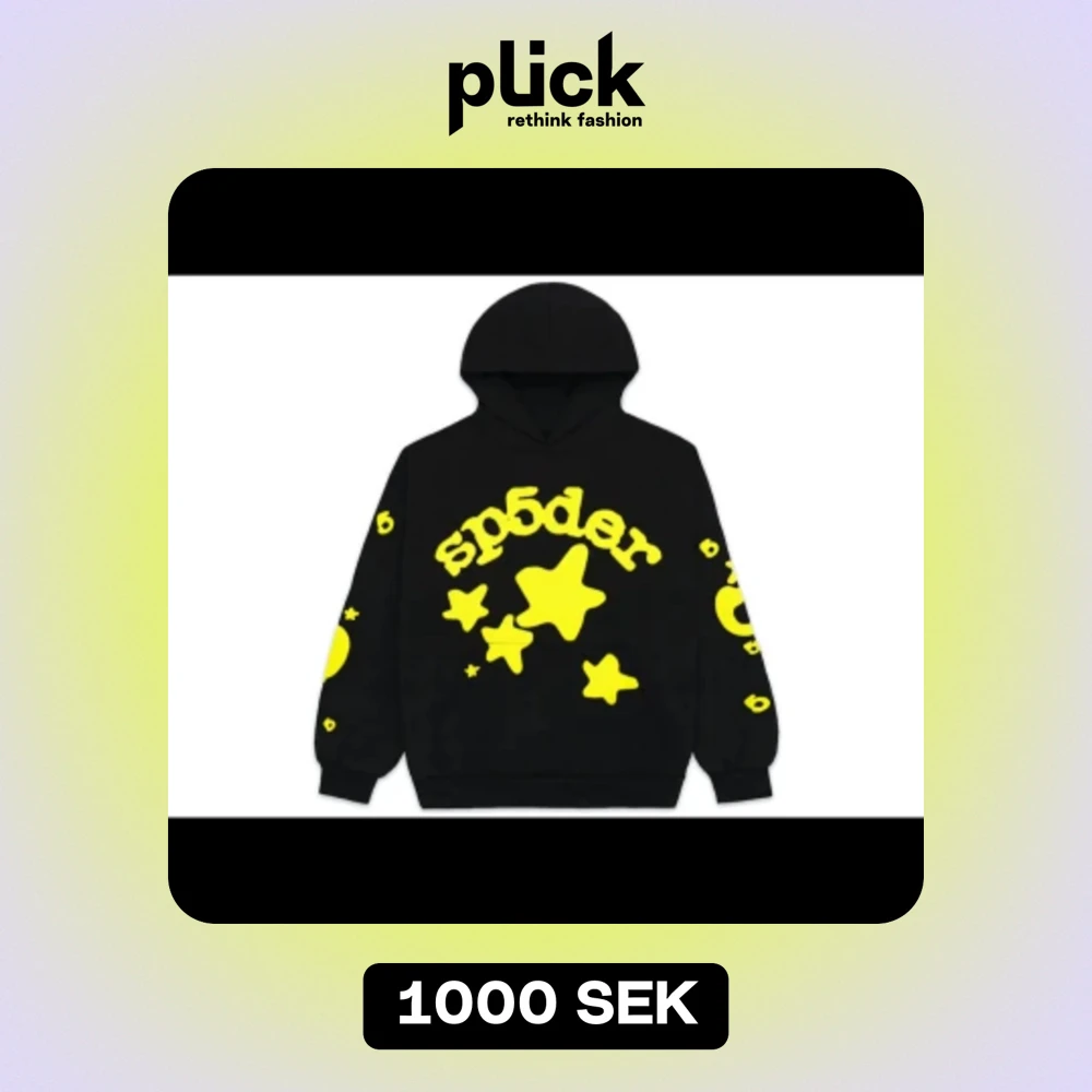 Säljer en cool svart hoodie från Sp5der med stora gula stjärnor och text på framsidan. Den har en klassisk passform med långa ärmar och en mysig huva. Perfekt för att sticka ut i mängden!