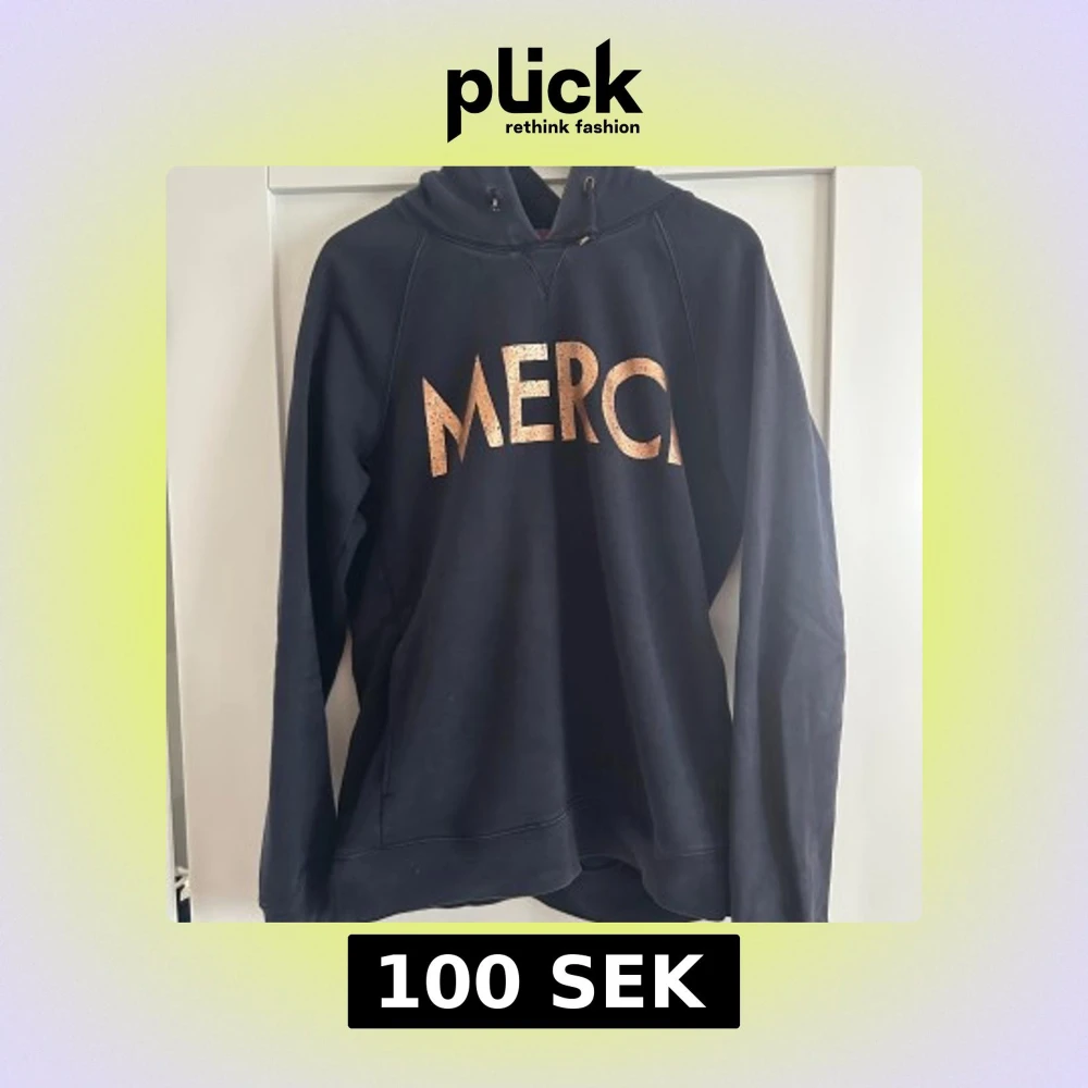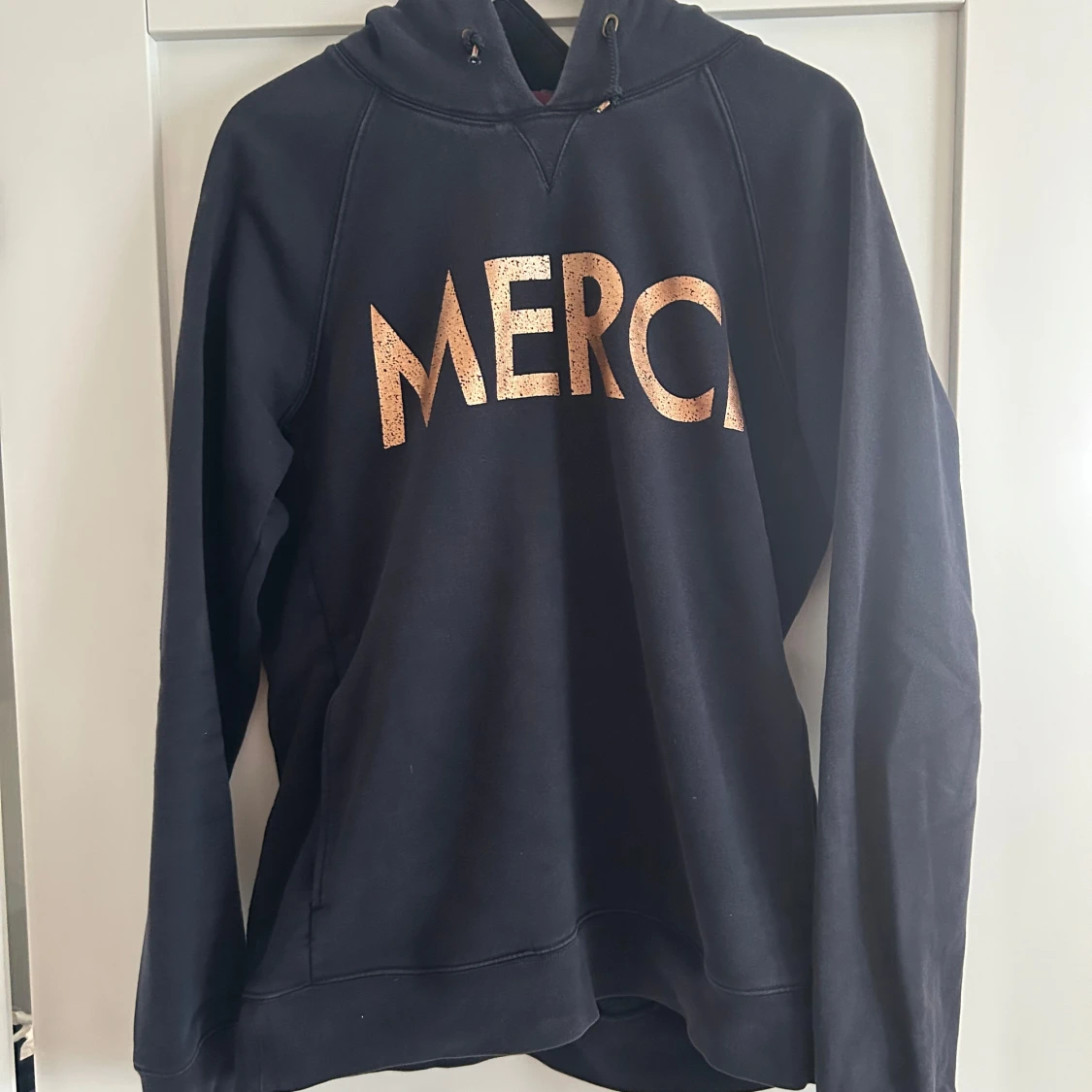 Svart hoodie med snyggt tryck i guldtexten 'MERCI' framtill. Tröjan har huva med snörning och långa ärmar. Perfekt för en chill och avslappnad stil.