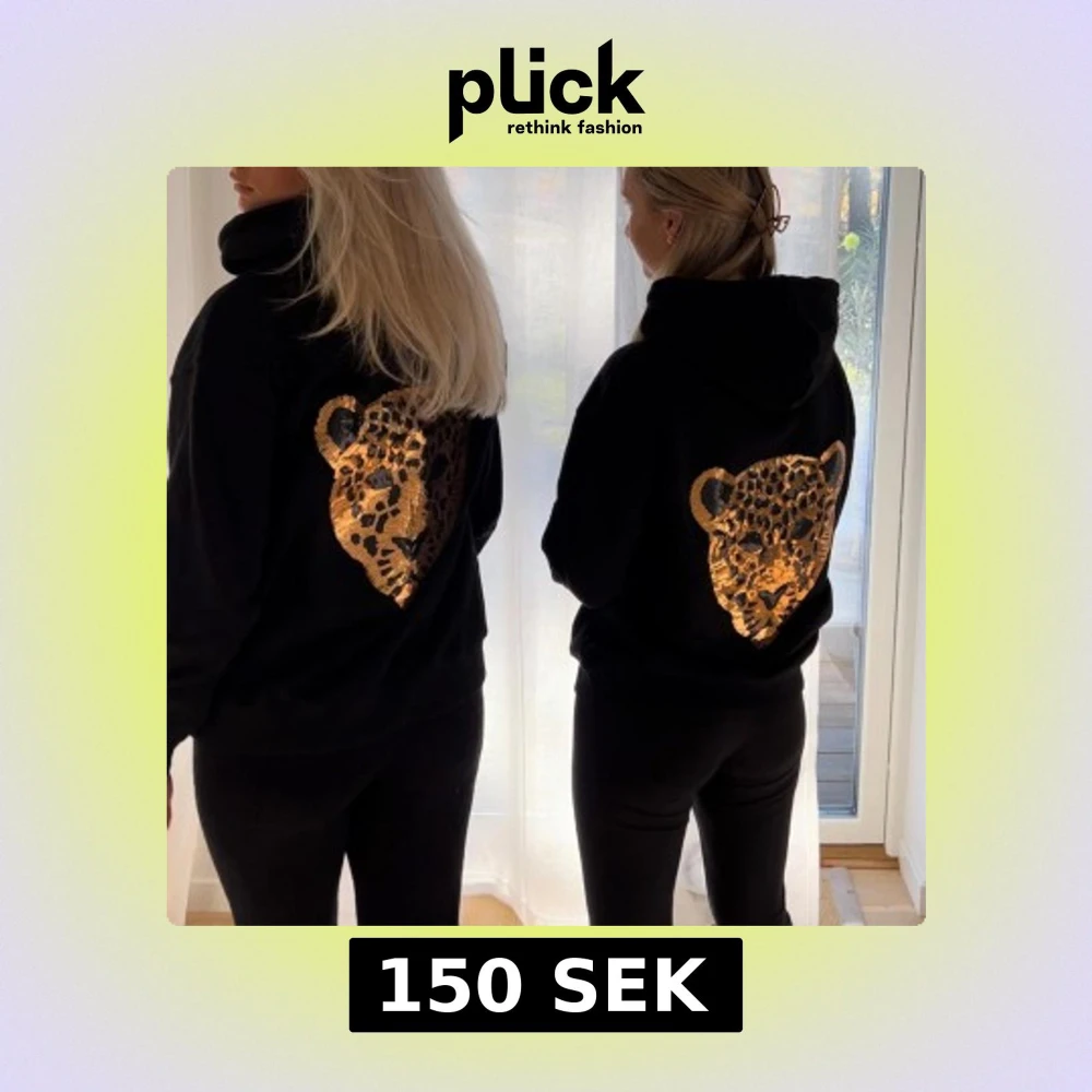 Säljer en svart hoodie med en stor glittrig leopard i guld på ryggen. Hoodien har normal passform och är perfekt för dig som vill sticka ut lite extra. Mjuk och skön med huva.