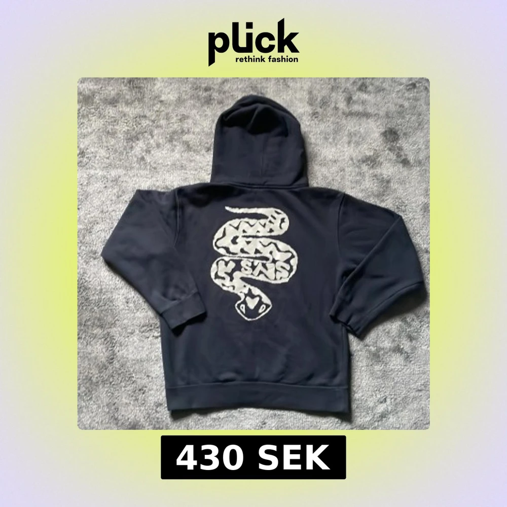 Snygg svart hoodie från SNS med ett coolt ormtryck i silver på ryggen och SNS-logga på bröstet. Perfekt för vintern, XS men passar som S