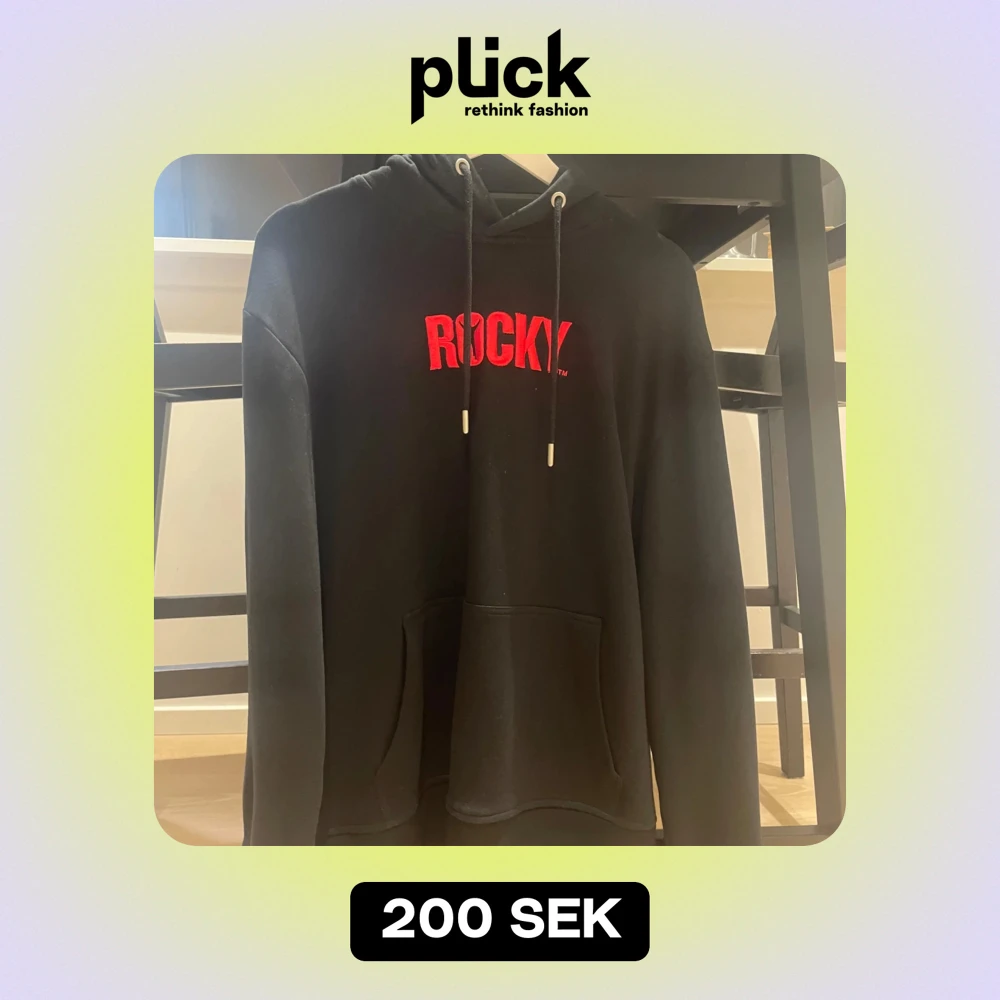 Säljer en svart hoodie med texten 'ROCKY' i rött på bröstet. Den har en klassisk design med dragsko i huvan och en stor ficka framtill. Perfekt för en avslappnad stil eller träning. Passar bra till både höst och vinter.