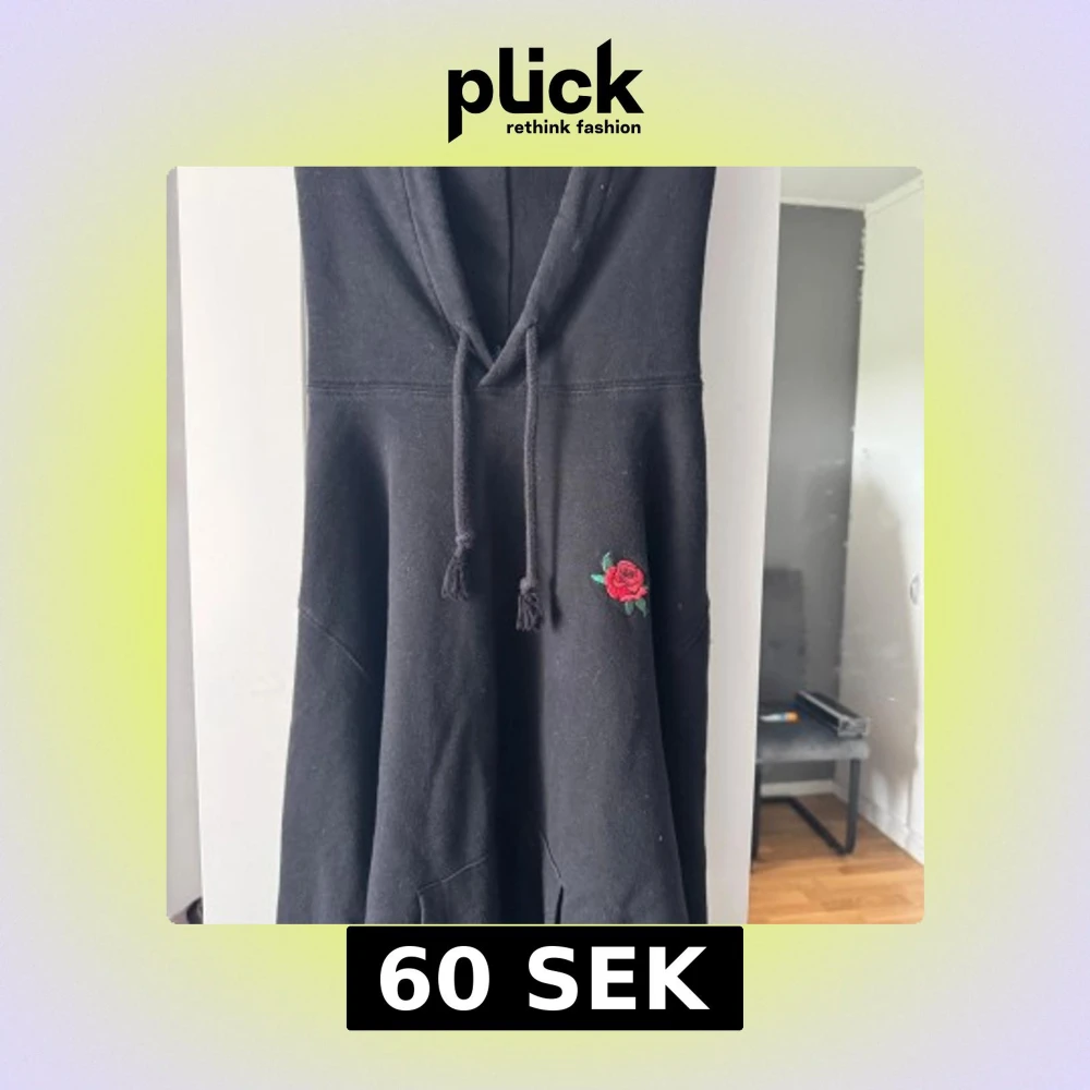 Svart hoodie med huva och snörning framtill. På bröstet finns ett broderat motiv av en röd ros med gröna blad. Tröjan har en klassisk känguruficka och är gjord i mjuk bomullsmix. Perfekt för en chill och stilren look.