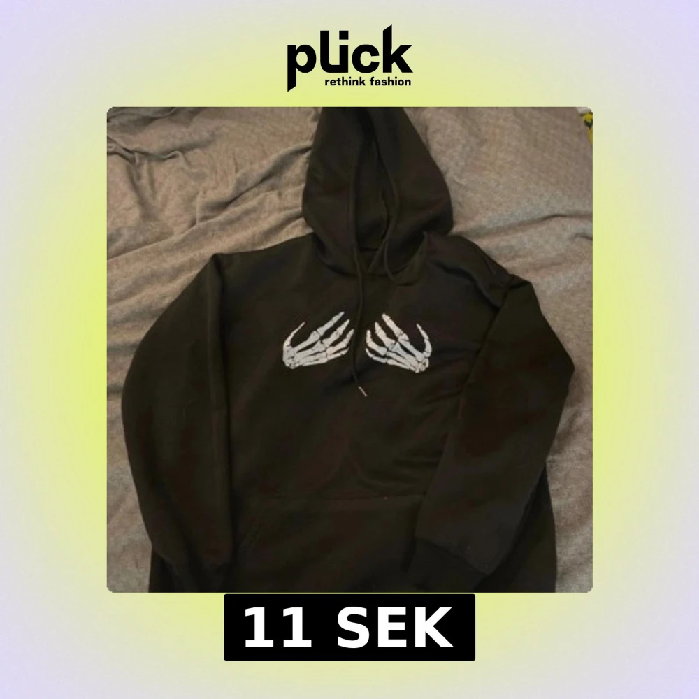 Svart hoodie från SHEIN med tryck av vita skelett-händer över bröstet. Tröjan har huva med snörning och en klassisk känguruficka framtill. Perfekt för dig som gillar edgy och coola detaljer. Mjuk insida och relaxed fit.