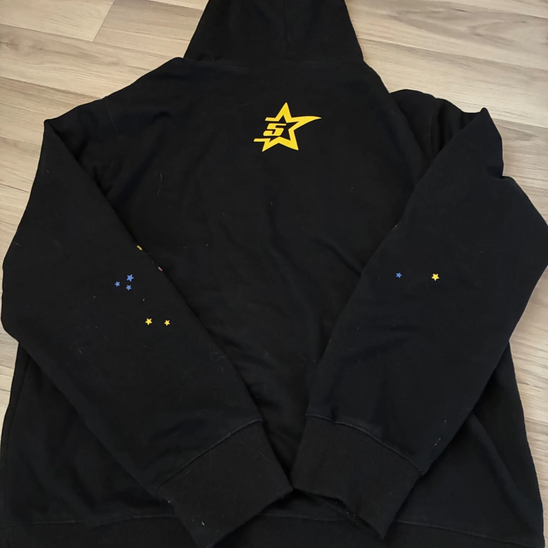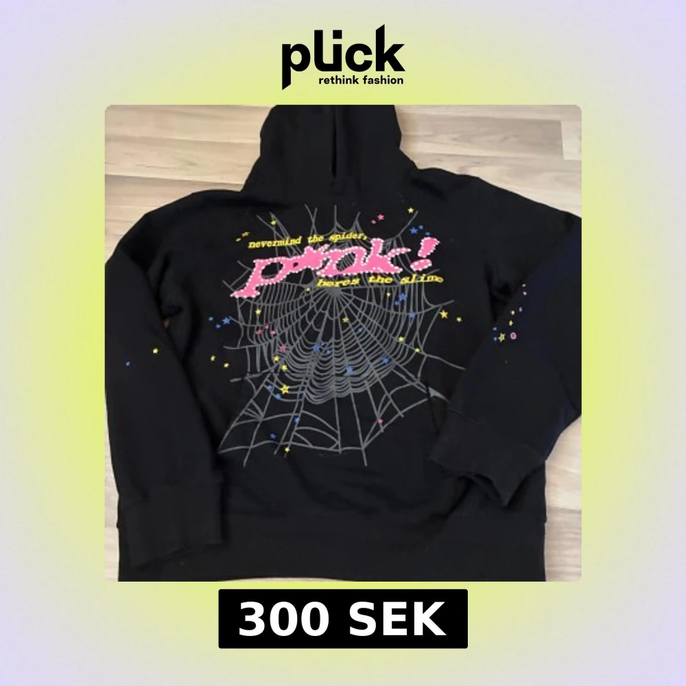 Svart hoodie med stor spindelnätsgrafik och texten 'nevermind the spiders, here's the slime' i rosa och gult framtill. Färgade stjärnor i blått och gult på ärmar och rygg, samt gul stjärnlogga bak. Mjuk bomullskänsla och huva.