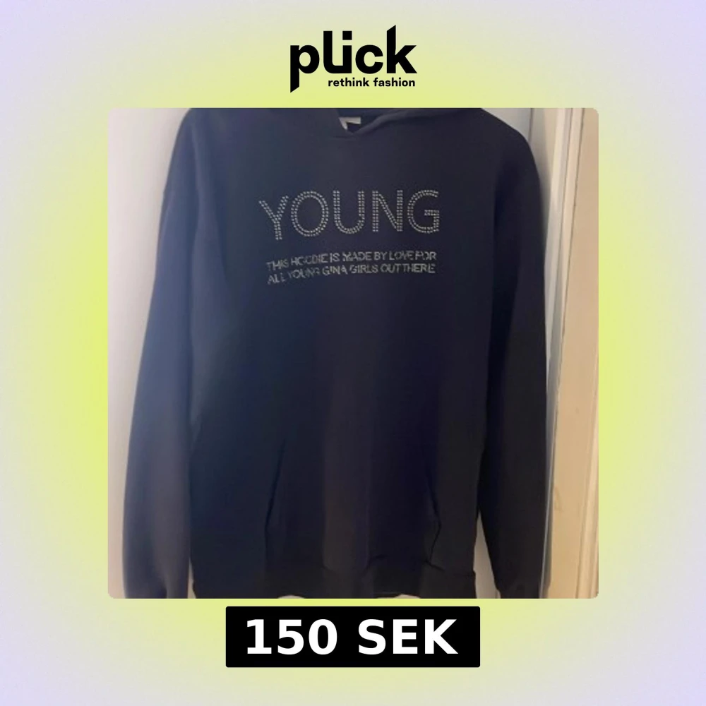 Cool svart hoodie från Gina Tricot med texten 'YOUNG' i glittriga strasstenar på bröstet. Mjuk och skön med huva och känguruficka framtill. Några diamanter är borta men syns knappt!