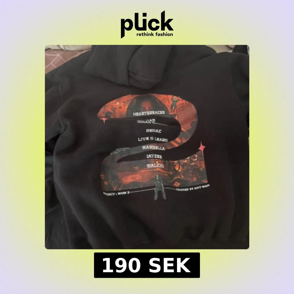 Svart hoodie med stort tryck på ryggen i rött och vitt, med text och grafik inspirerad av Ant Wan och Project Wow 2. Klassisk huva och mjukt material, perfekt för dig som gillar streetwear och musik.