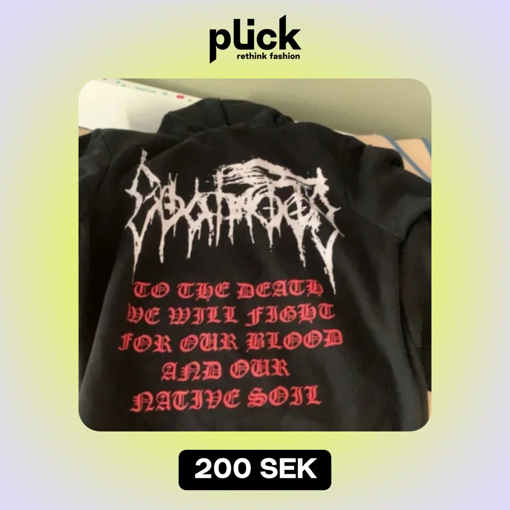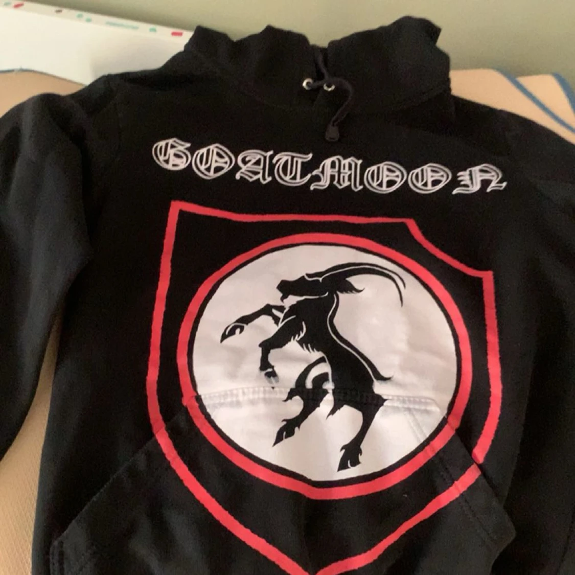 Säljer en svart hoodie från Goatmoon med tryck på både fram- och baksidan. På framsidan finns en stor get-symbol inuti en röd cirkel och texten 'GOATMOON' ovanför. På baksidan står det 'TO THE DEATH WE WILL FIGHT FOR OUR BLOOD AND OUR NATIVE SOIL' i röd text. Hoodien har en dragkedja och en ficka på magen. Perfekt för höst och vinter!