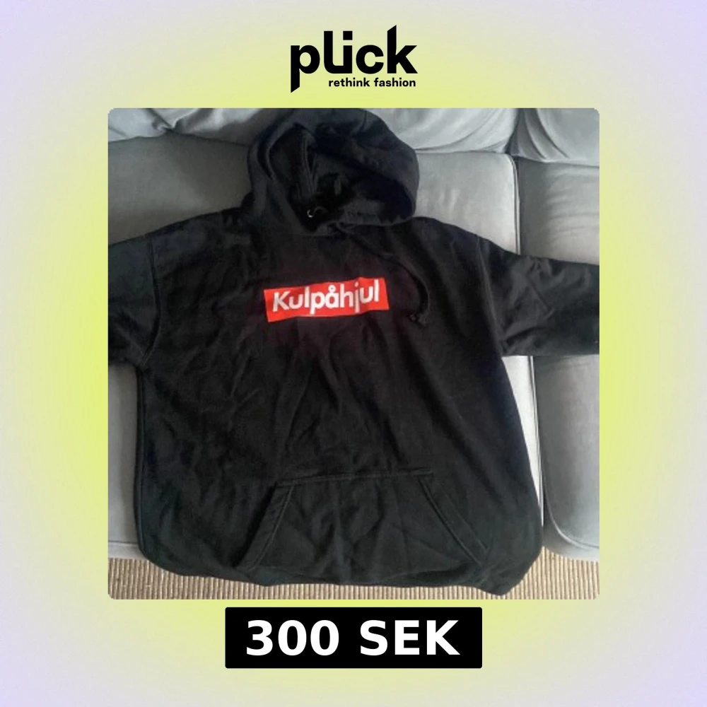 Säljer en svart hoodie med tryck från Kulpåhjul. Framsidan har en röd och vit logga, medan baksidan har ett stort tryck med texten 'Boost Loading' och en bild av turbos. Perfekt för bilentusiaster!