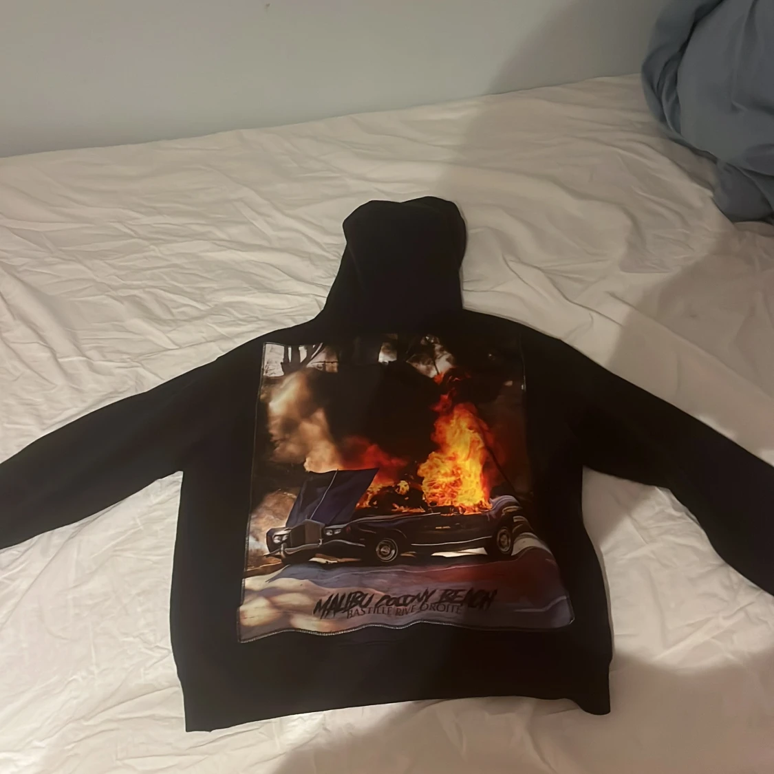Svart hoodie med stor färgstark print på ryggen som visar en brinnande bil och texten 'MIAMI DOOMY BEACH'. Klassisk modell med huva och långa ärmar. Mjuk insida och ribbade muddar. Perfekt för dig som gillar streetwear och unika motiv.