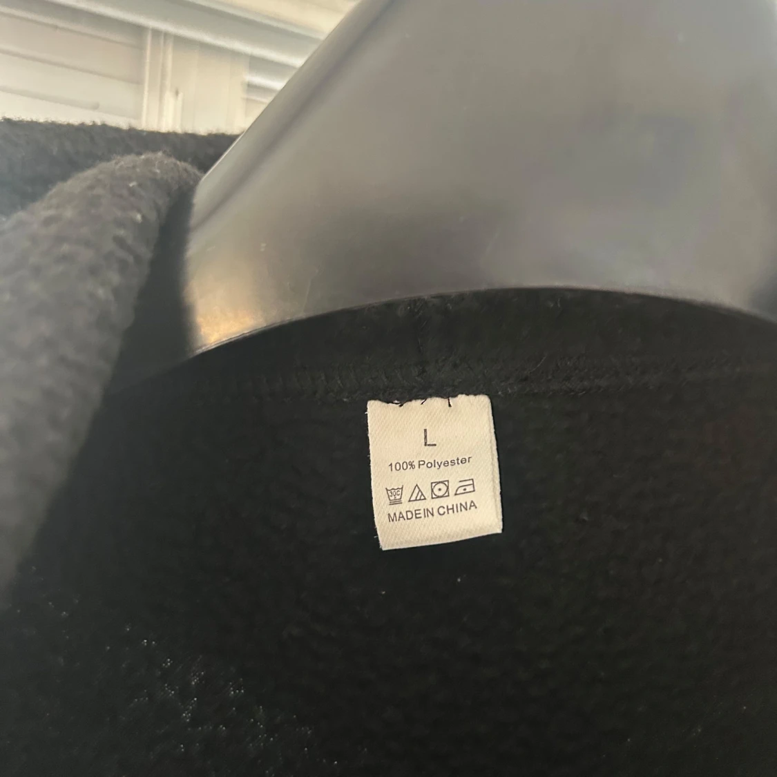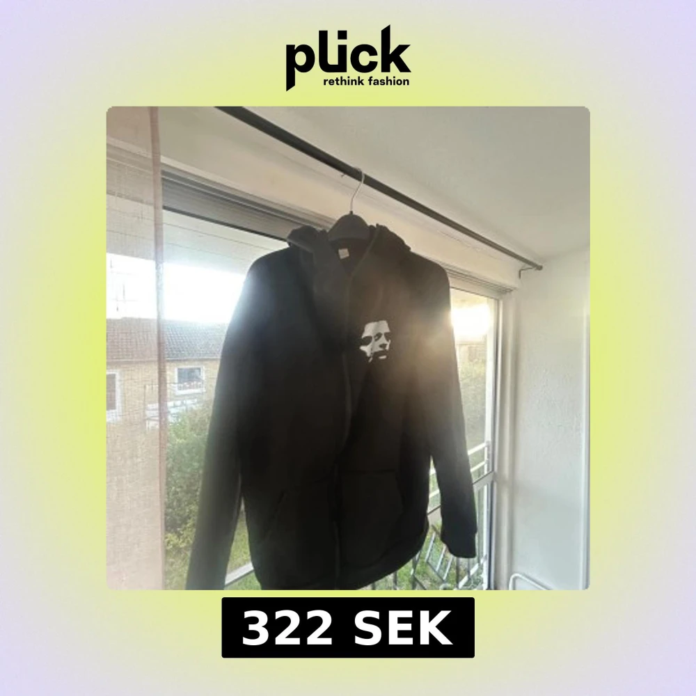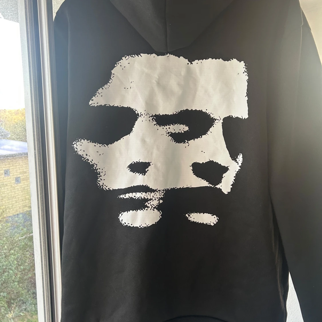 Svart hoodie med stor vit ansiktsgrafik tryckt på ryggen och mindre tryck på bröstet. Tröjan har huva, långa ärmar och känguruficka framtill. Perfekt för dig som gillar streetstyle och vill sticka ut.