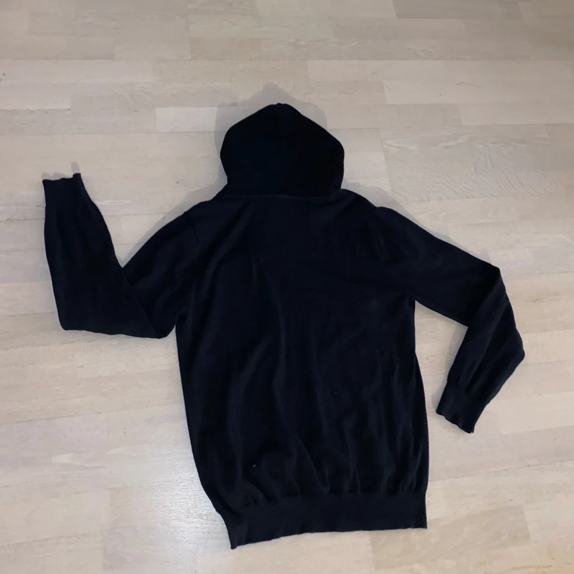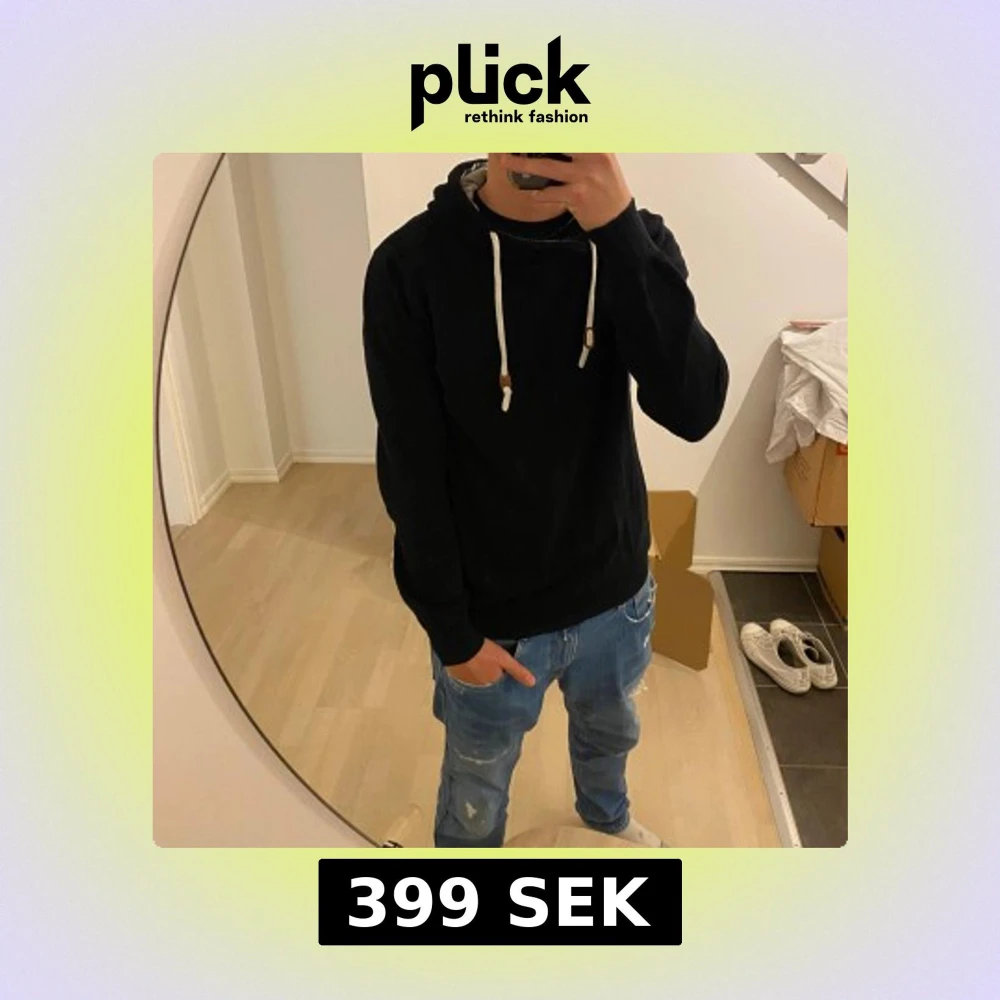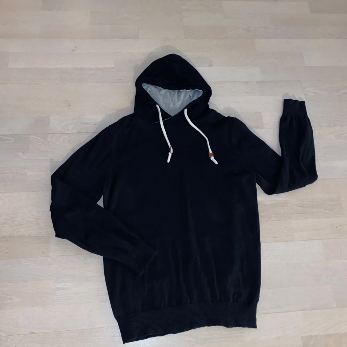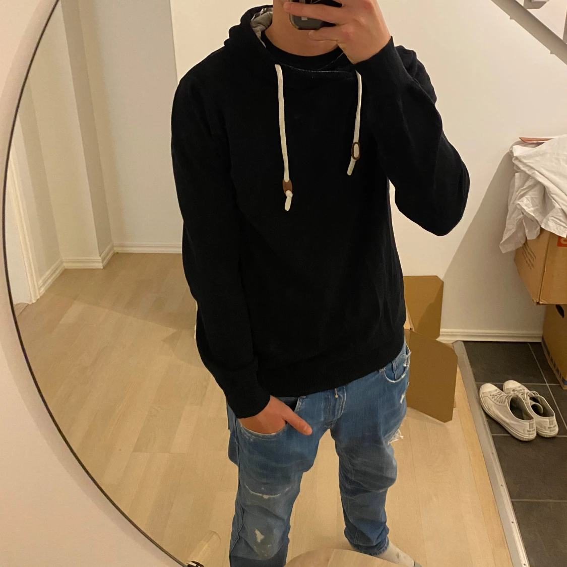 Säljer en enkel svart hoodie med vita dragsnören och huva. Tröjan har långa ärmar och ribbade muddar vid ärmslut och nederkant. Perfekt för en avslappnad stil.