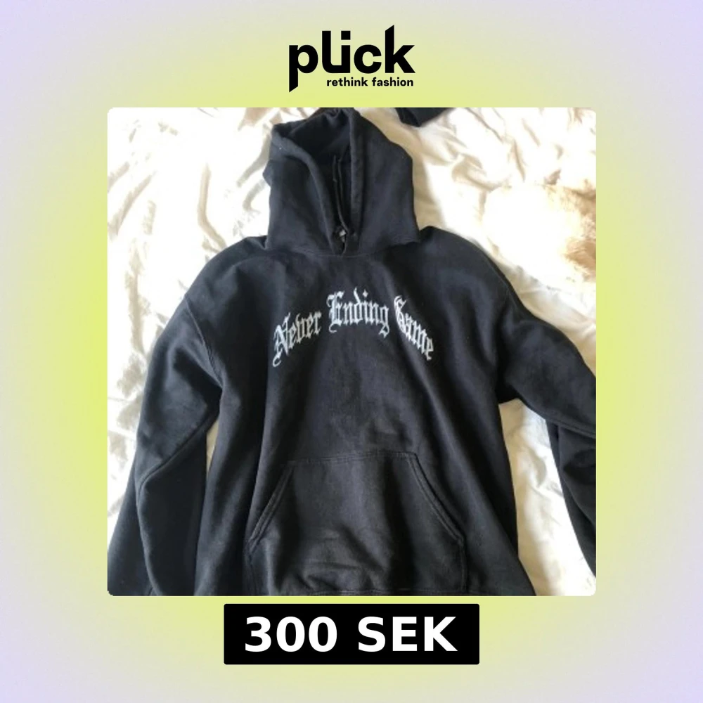 Svart hoodie från Gildan med tryck 'Never Ending Game' på bröstet och 'God Forgives, N.E.G. Don't.' på ryggen. Klassisk känguruficka framtill och huva med snörning. Heavy Blend-material.