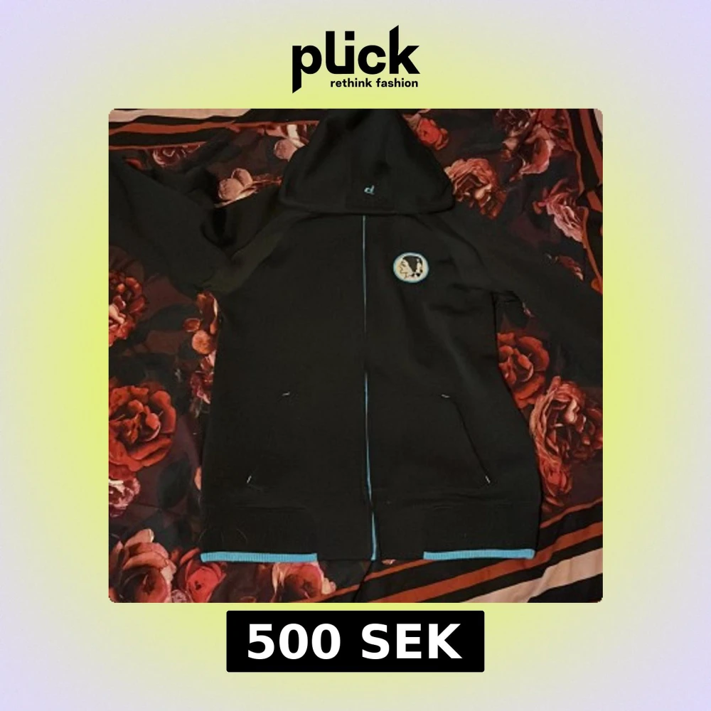 Svart hoodie från Peak Performance med ljusblå detaljer och dragkedja. Har huva, två fickor och broderad logga på bröstet. Snyggt tryck på ena ärmen och ribbade muddar med blå kant.