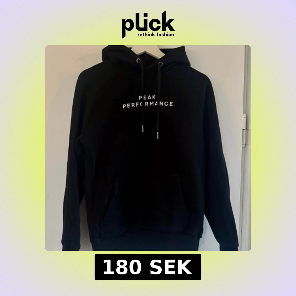 Svart hoodie från Peak Performance i storlek S. Klassisk modell med huva, snörning och magficka. Vit broderad logga på bröstet ger en clean look. Perfekt för chill dagar eller när du vill ha en enkel streetstyle.