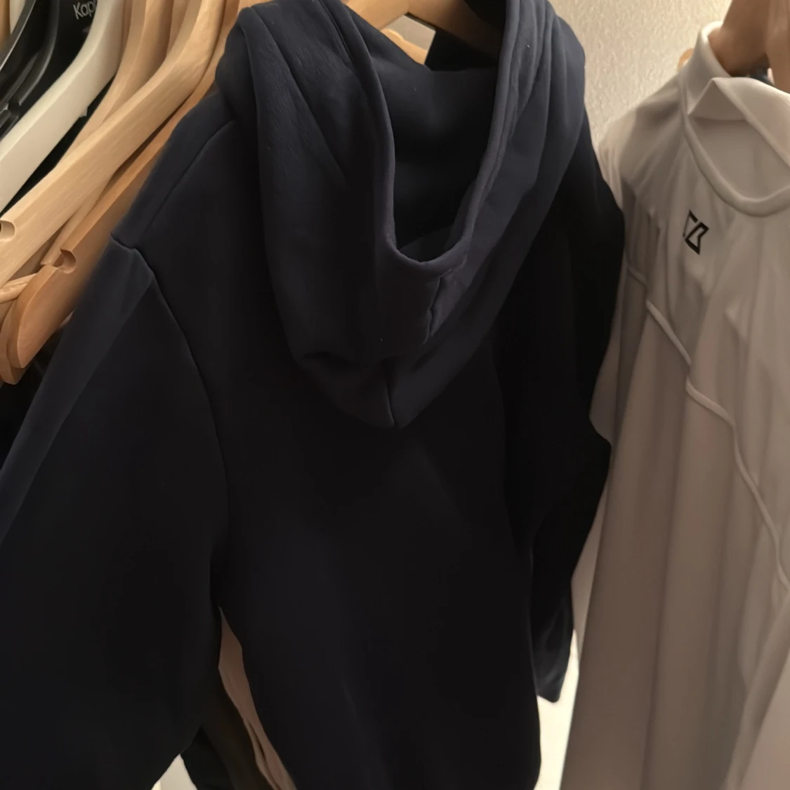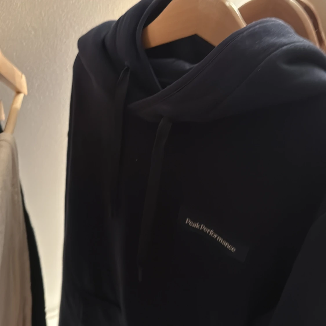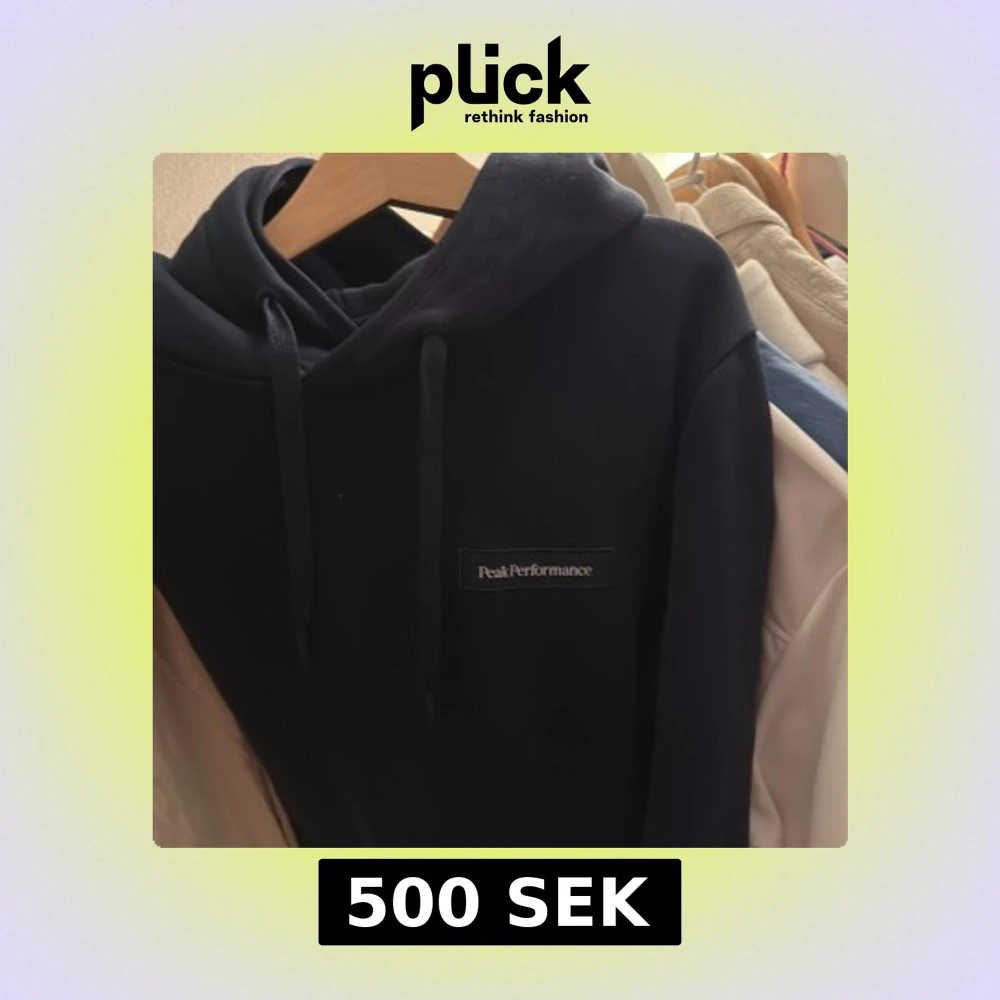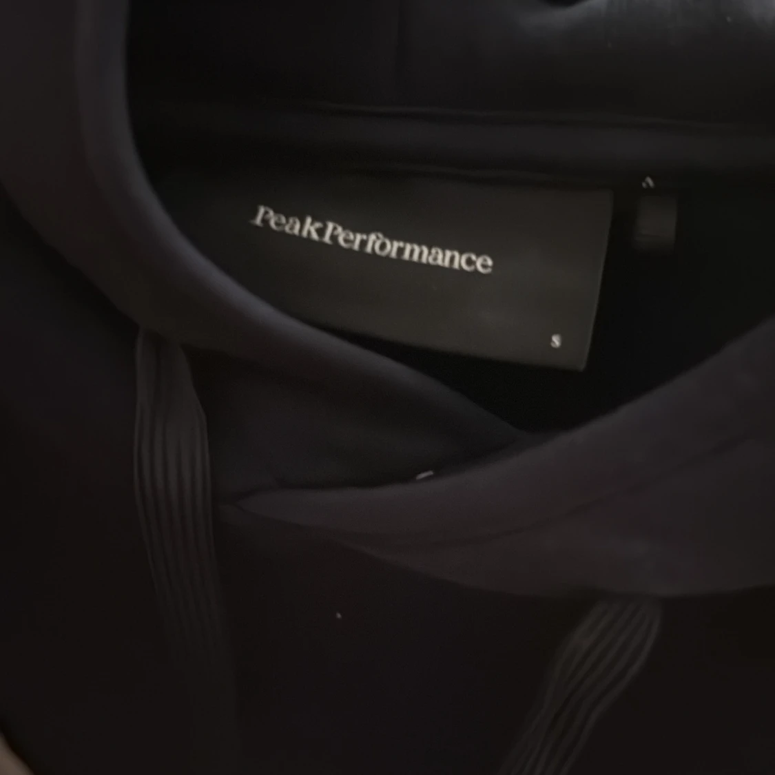 Svart hoodie från Peak Performance i storlek S. Klassisk modell med huva och snörning, samt diskret logga på bröstet. Perfekt för chill dagar eller när du vill ha en enkel och snygg look.