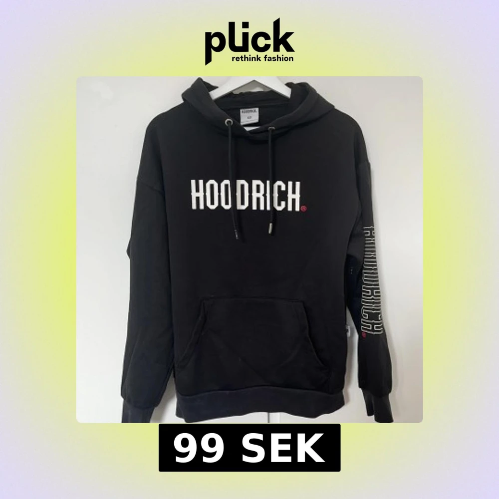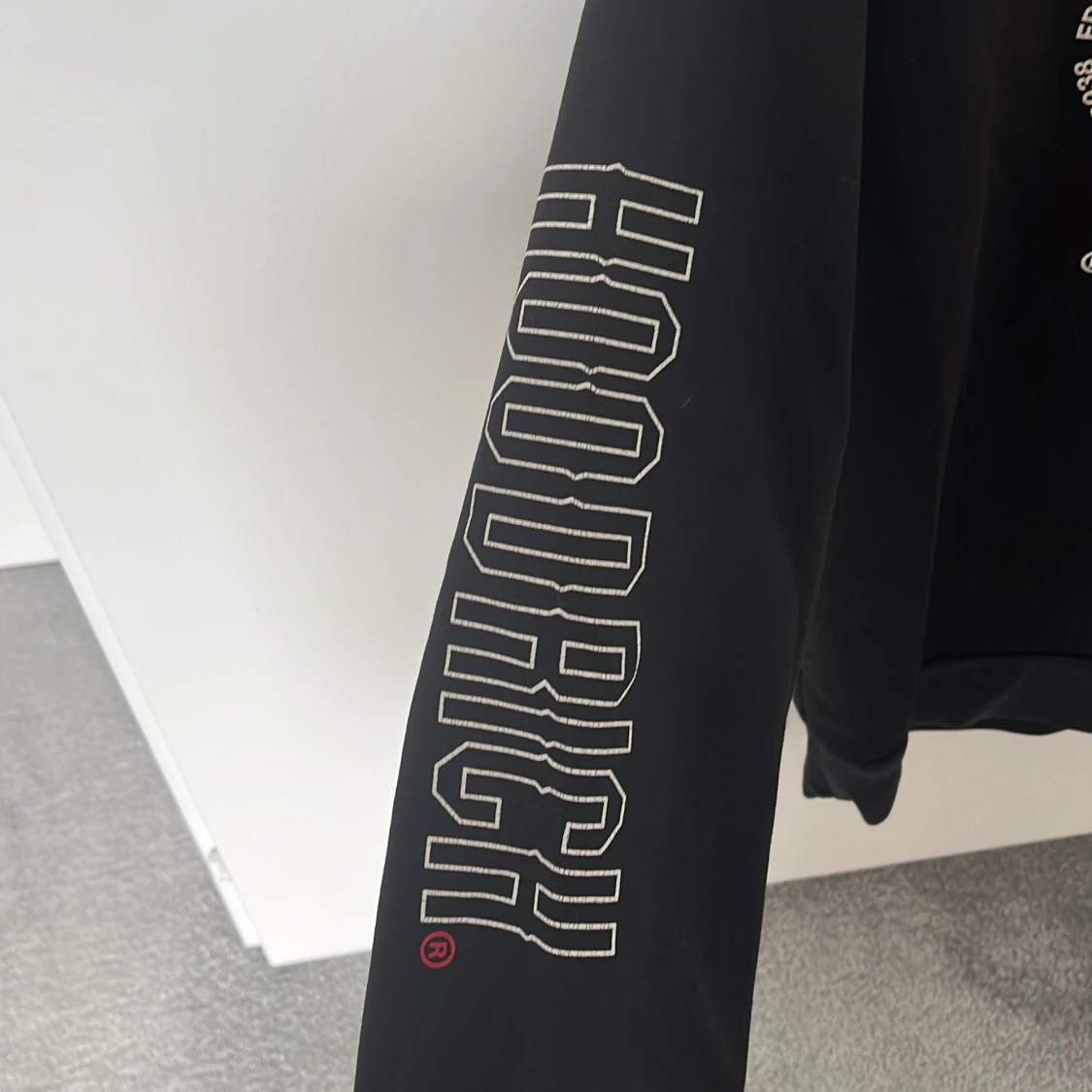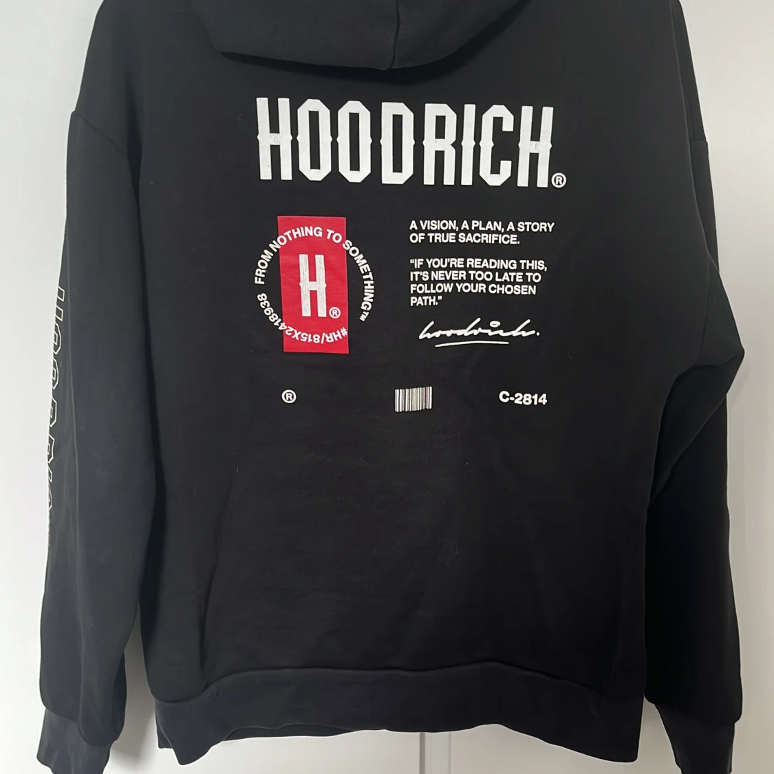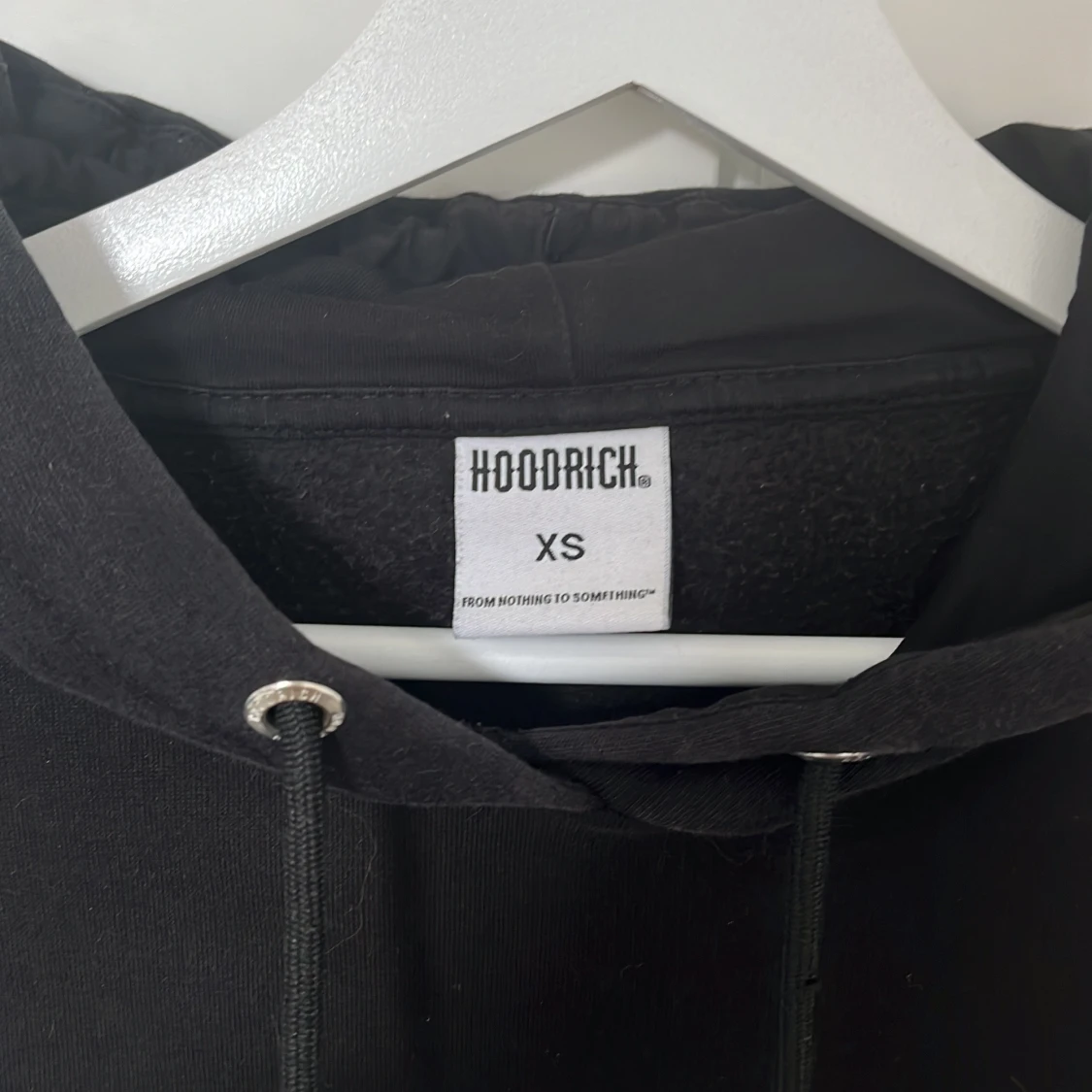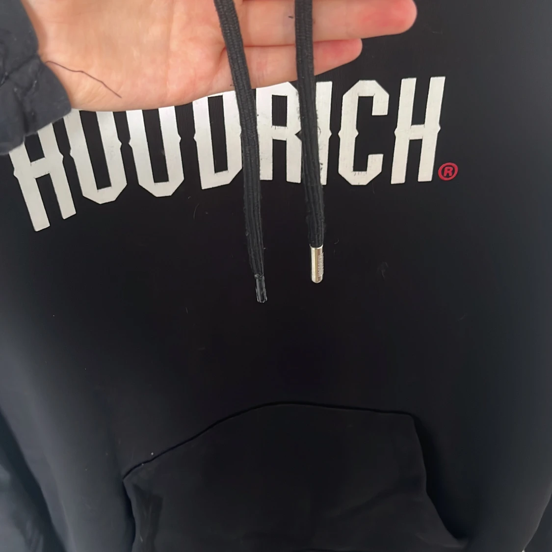 Svart hoodie från HOODRICH med stor vit logga på bröstet, tryck på ryggen och ena ärmen. Storlek xs men passar också S. Metallgrejen längst ner på ena snöret har ramlat av.