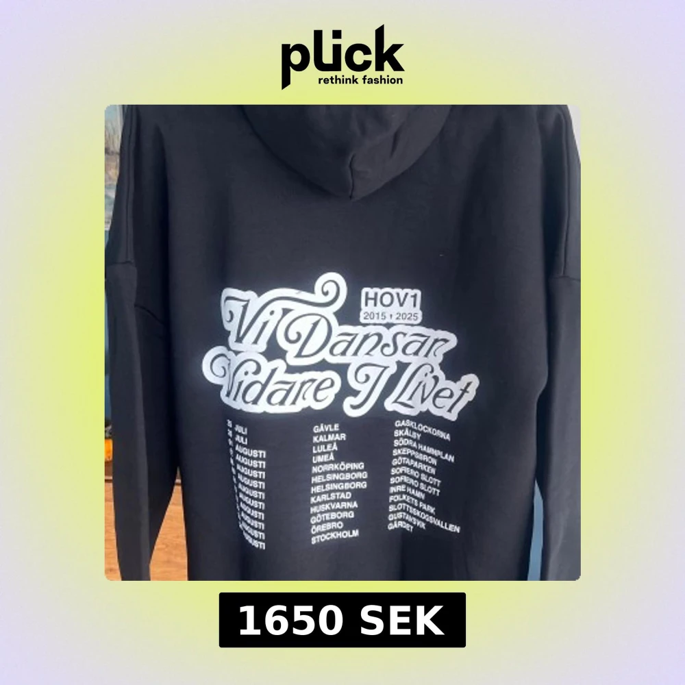 ”Oanvänd ”Svart hoodie från Hov1 med stor vit text 'Vi Dansar Vidare I Livet' och turnédatum på ryggen. Framtill finns en liten broderad krona på bröstet. Klassisk känguruficka och huva. Perfekt för dig som gillar svensk musik och streetwear.