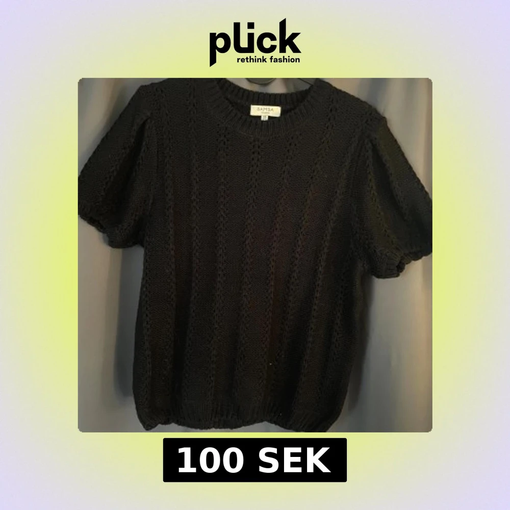 Säljer en svart stickad tröja med korta puffärmar och rund halsringning. Tröjan har ett snyggt hålmönster i lodräta rader och ribbade kanter. Jätte fin och perfekt till hösten. Säljs för att den inte kommer till användning. Kontakta för egna bilder.