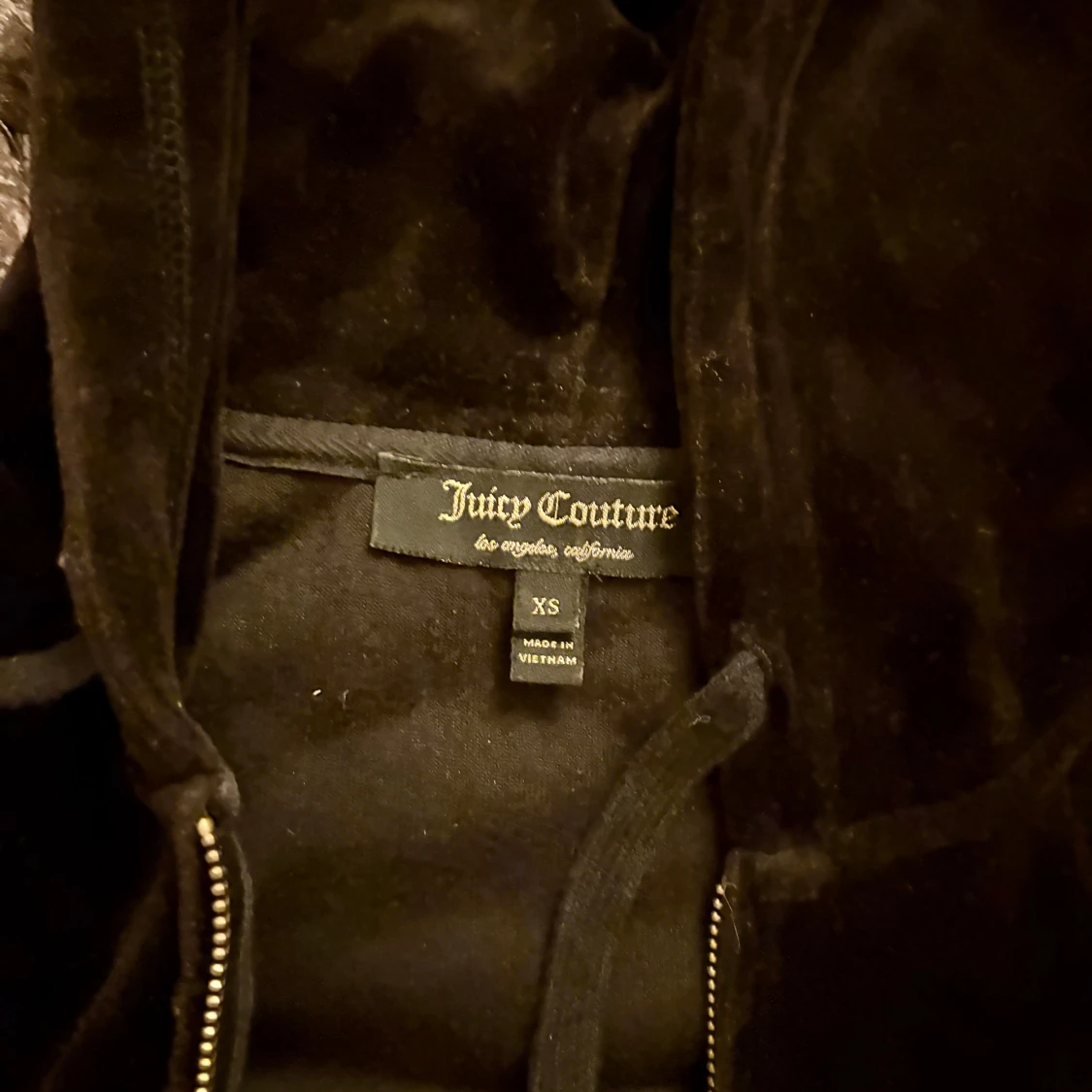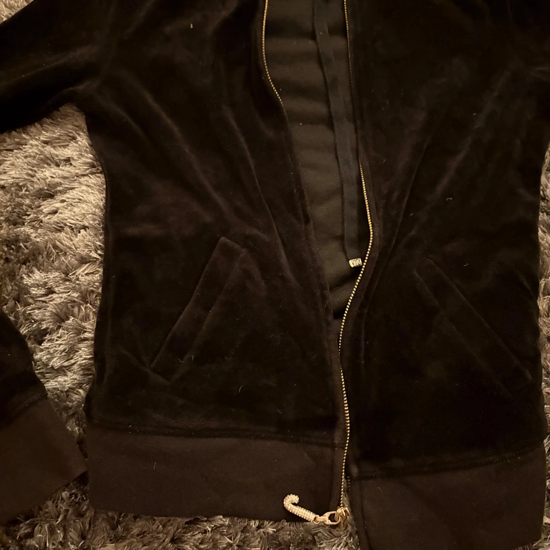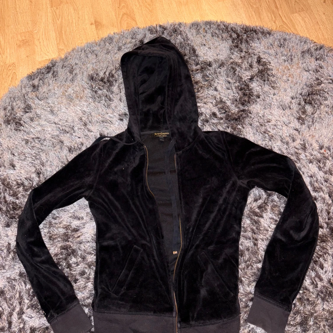 Svart velourjacka från Juicy Couture med huva och dragkedja i guld. Jackan har långa ärmar, ribbade muddar och fickor framtill. Klassisk slim passform och ikonisk JC-detalj på dragkedjan. 💗 Nypris 1.300kr