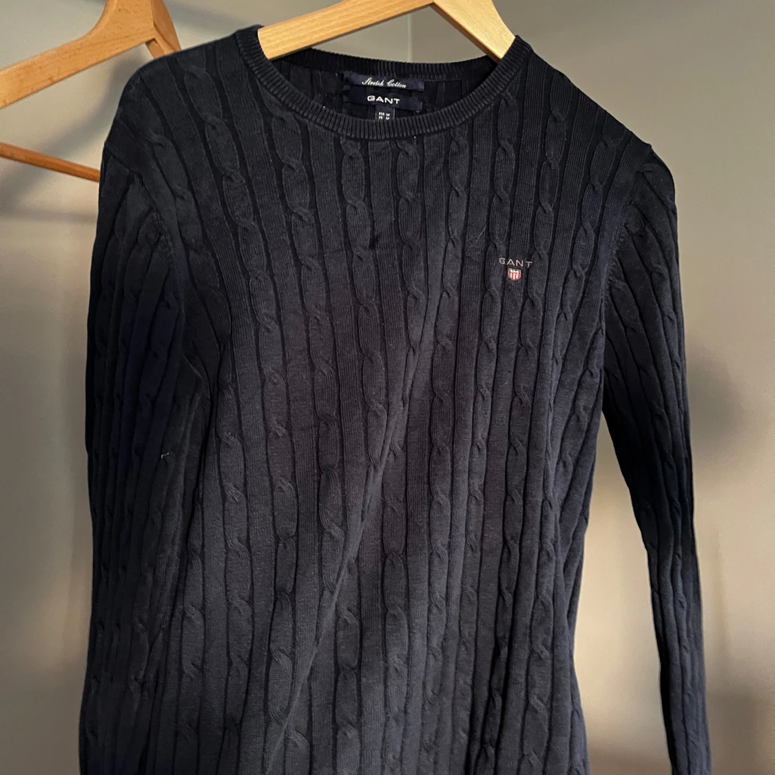 Kabelstickad marin blå tröja från Gant med rund halsringning och diskret logga på bröstet. Tröjan har lång ärm och klassisk passform, perfekt för en stilren look. Materialet är mjukt och bekvämt, passar till många olika outfits. Lite luddigt.