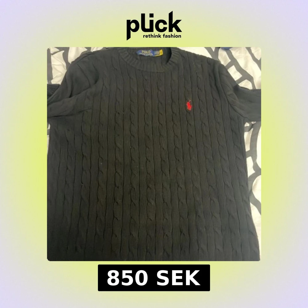 Säljer en stilren svart kabelstickad tröja från Polo Ralph Lauren. Tröjan har en klassisk design med rund hals och det ikoniska röda broderade logotypen på bröstet. Perfekt för en elegant och avslappnad look.