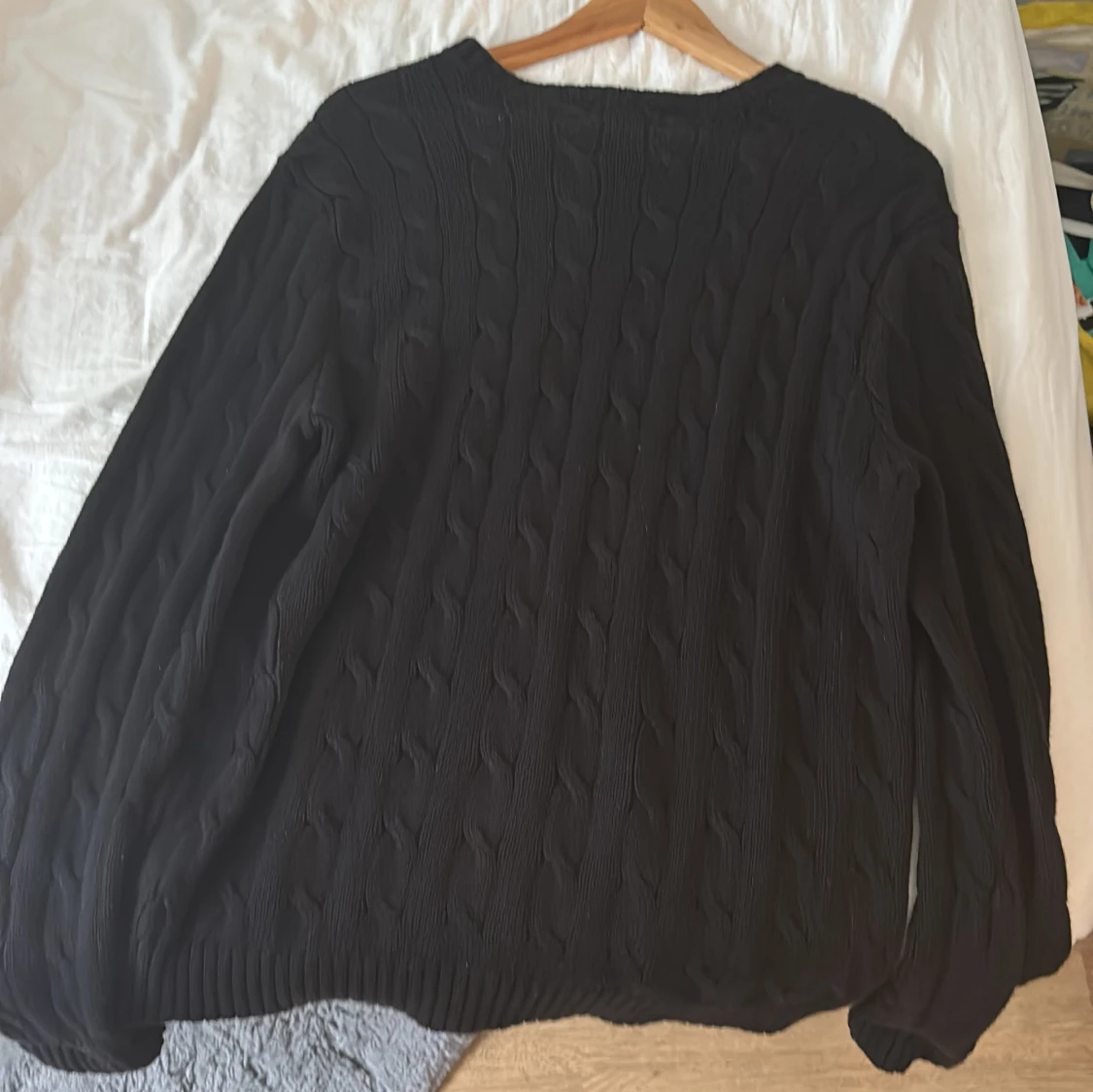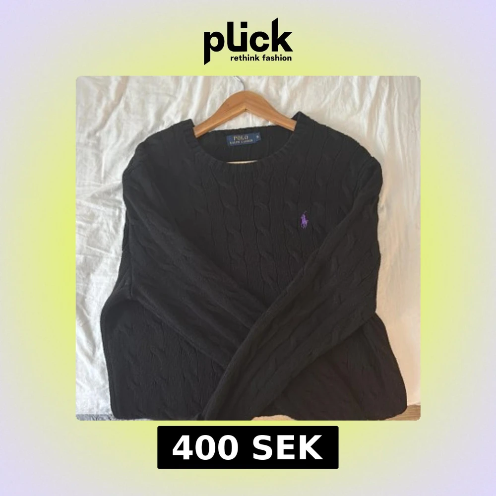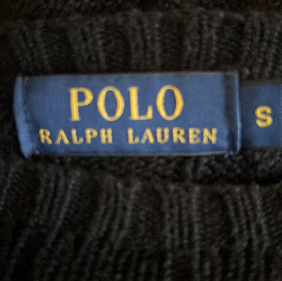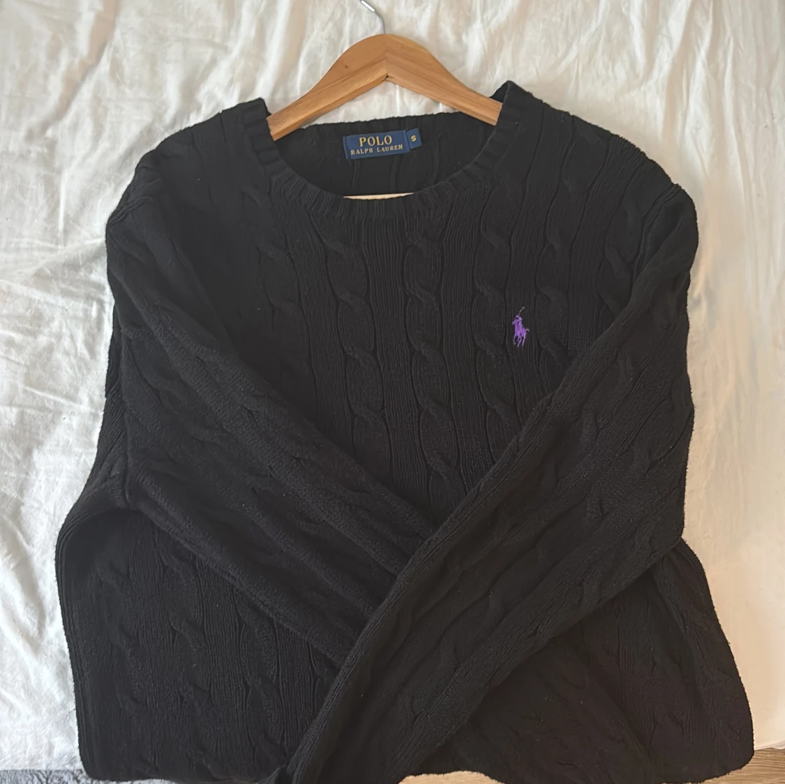 Kabelstickad svart tröja från Polo Ralph Lauren med lila broderad logga på bröstet. Klassisk rund halsringning och långa ärmar. Tröjan är i bomull och har ribbade muddar vid ärmslut och nederkant. Perfekt för en stilren och chill look.