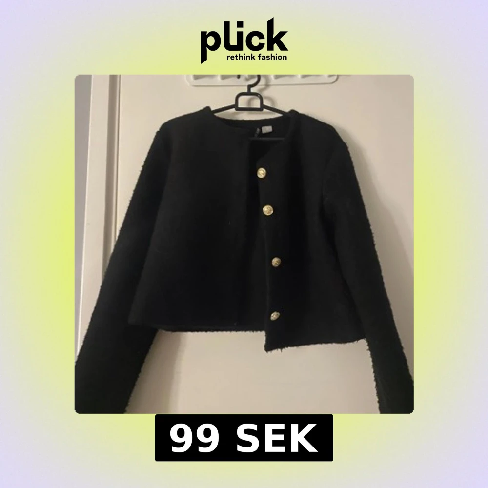 Snygg svart kavaj från H&M med guldknappar framtill. Den har en croppad design och långa ärmar, perfekt för en stilren look. Passar bra till både vardag och festliga tillfällen.