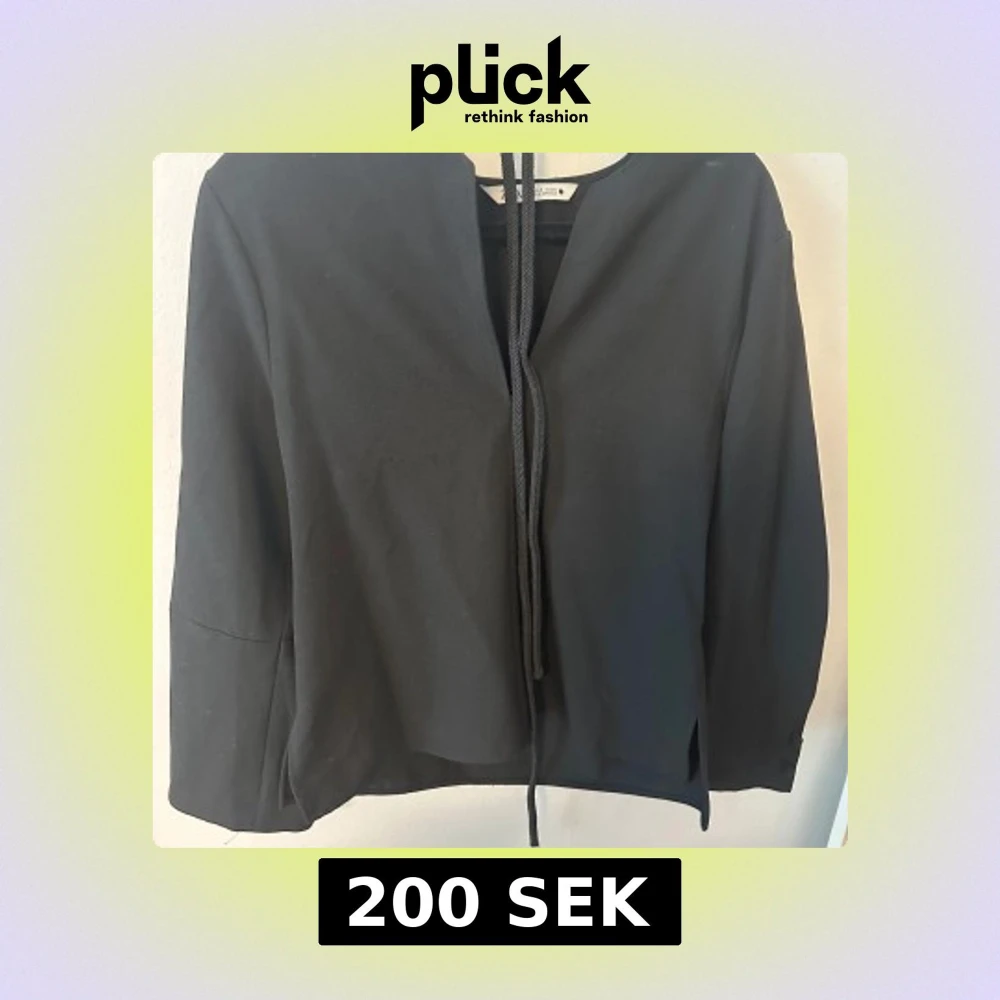 Stilren svart kavaj från Zara med knytband framtill och dekorativa knappar vid ärmslut. Kavajen har lång ärm och slits i sidorna, perfekt för en trendig och enkel look. Man knyter bandet i midjan. Saknar en boll på ena sidan av armen