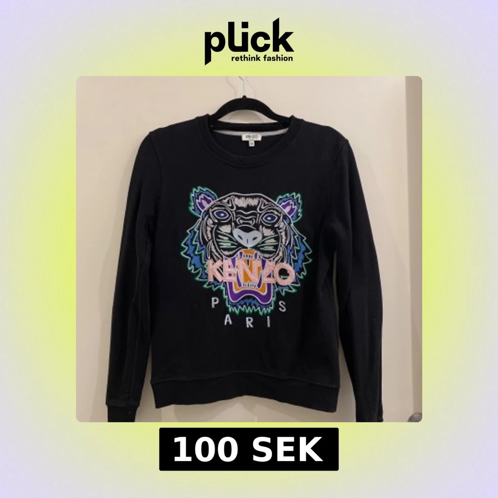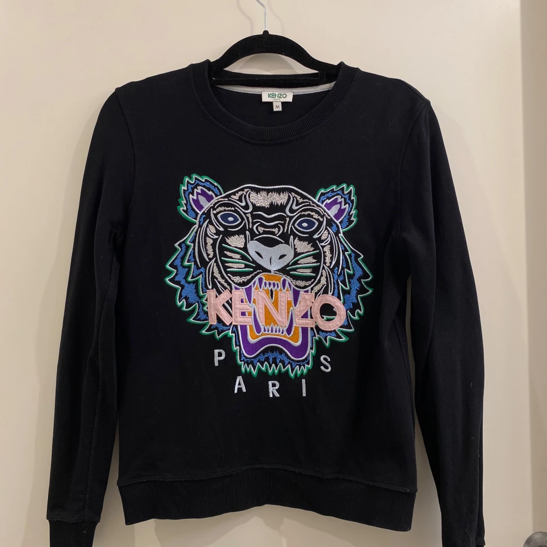 Svart sweatshirt från Kenzo med ikonisk broderad tiger i flera färger på bröstet och Kenzo Paris-text. Tröjan har rund hals, långa ärmar och ribbade muddar.