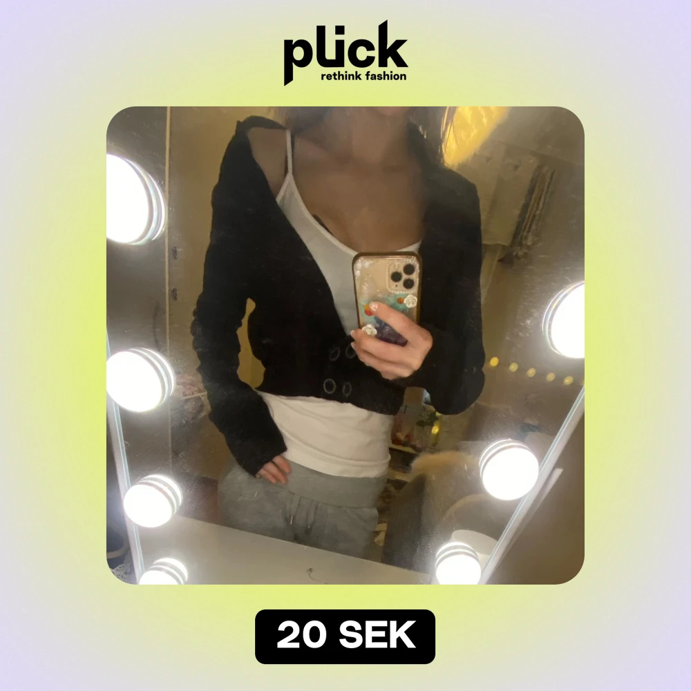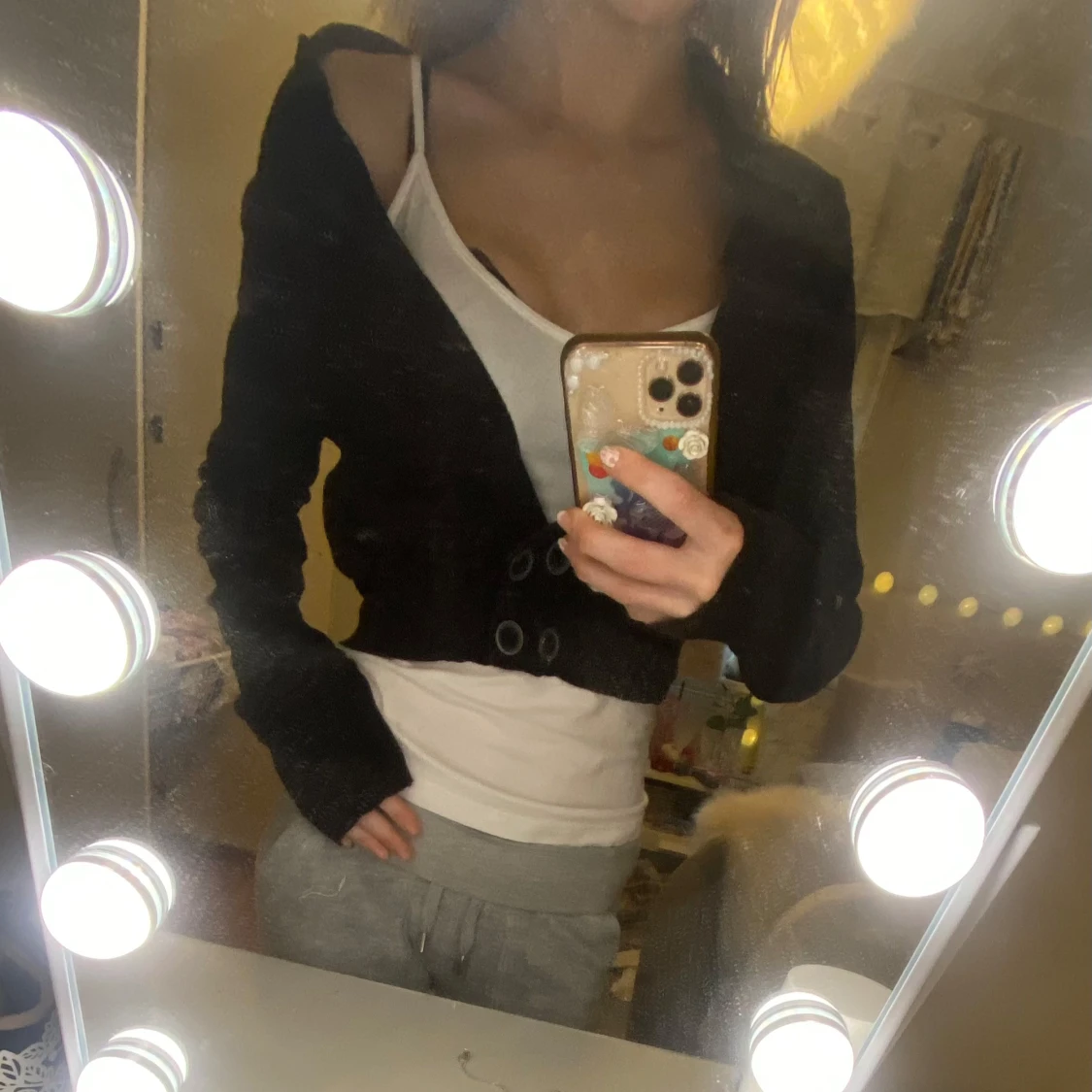 En svart kofta med knappar längst ner. Man kan ha den både öppen och med knapparna men det är bara knappar längst ner. Den är storlek xs och lite längre i armarna så den går över händerna vilket jag tycker är fint.