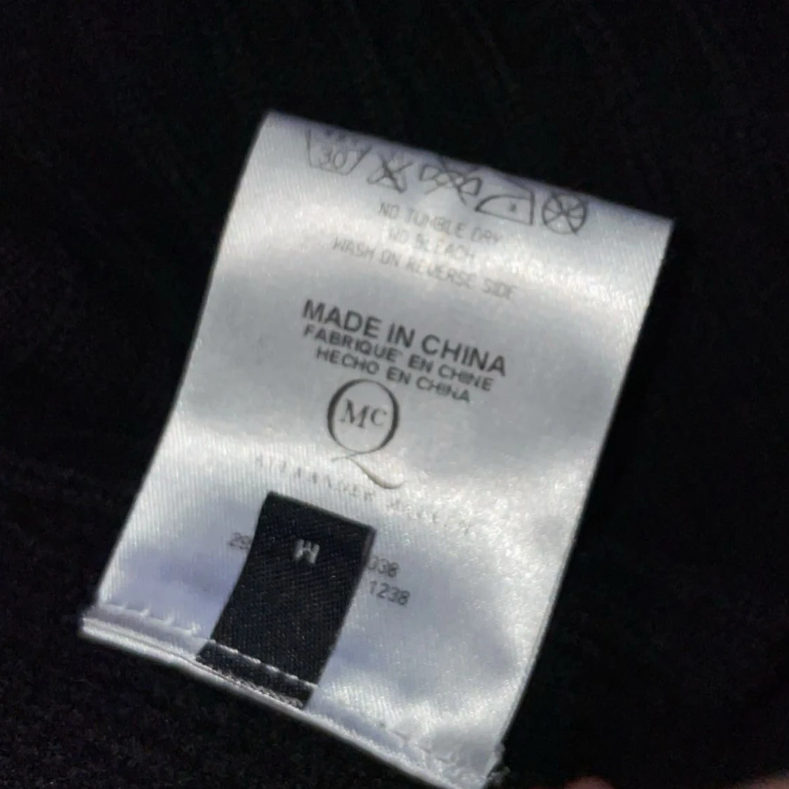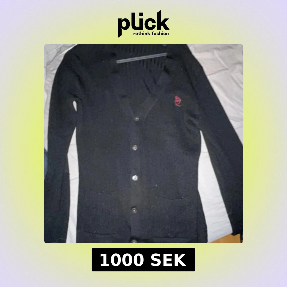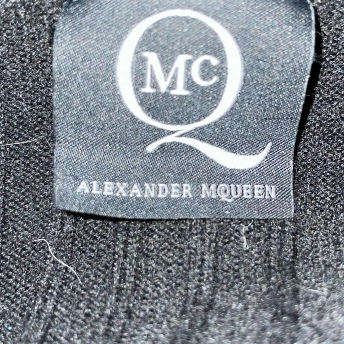 Säljer en svart stickad kofta från Alexander McQueen med knappar framtill och två fickor. Koftan har en broderad röd logga på bröstet och v-ringad hals. Perfekt för dig som gillar stilrena och exklusiva plagg.