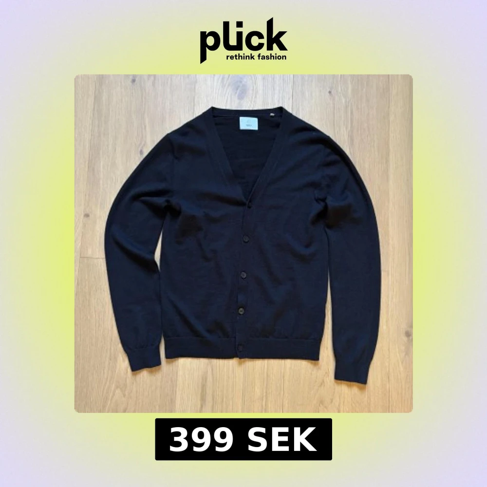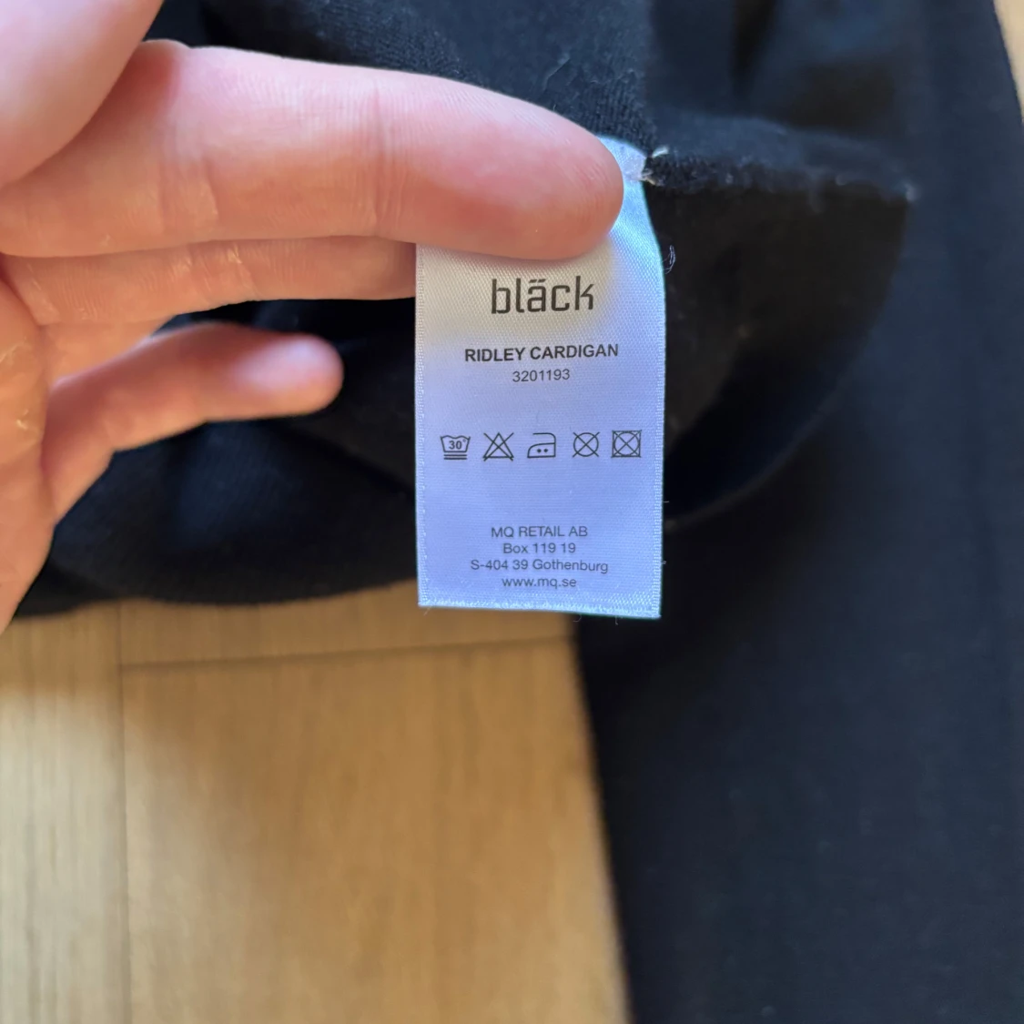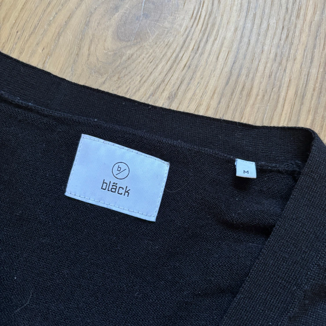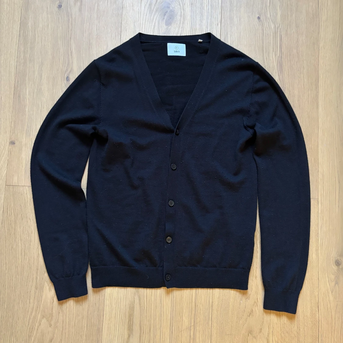 Säljer en stilren svart kofta från Bläck i 100% merinoull. Storlek M men passar S. Koftan har en v-ringad design med knappar framtill och långa ärmar. Perfekt för att hålla sig varm och snygg under kyligare dagar.