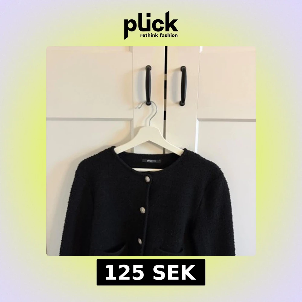 Stilren svart kofta från Gina Tricot med rund halsringning och dekorativa silvriga knappar framtill. Koftan har två fickor och är tillverkad i ett grovstickat material som ger en mysig känsla. Perfekt att slänga på sig över en t-shirt eller topp.