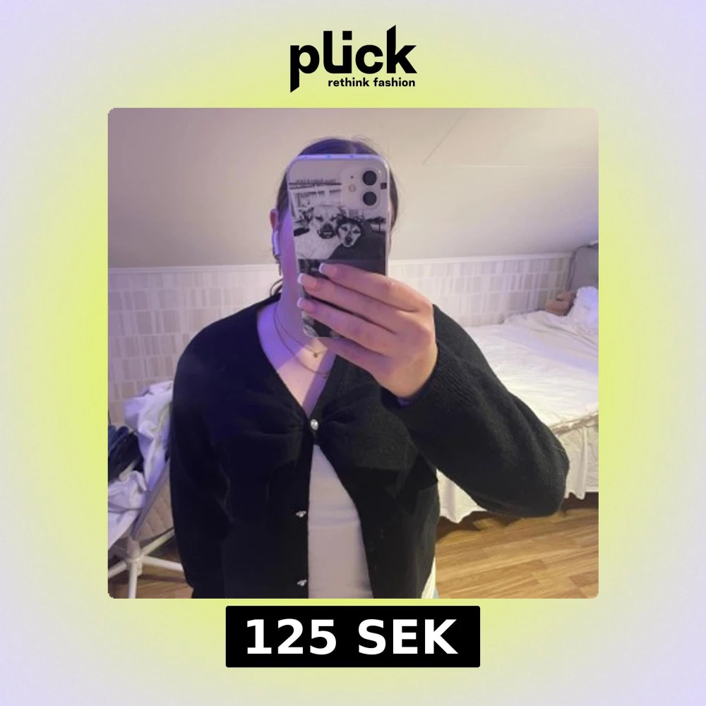 Säljer en elegant svart kofta från Kappahl med dekorativa knappar och en stor rosett framtill. Perfekt för att ge en stilren touch till din outfit. Koftan har långa ärmar och är tillverkad i ett mjukt material.