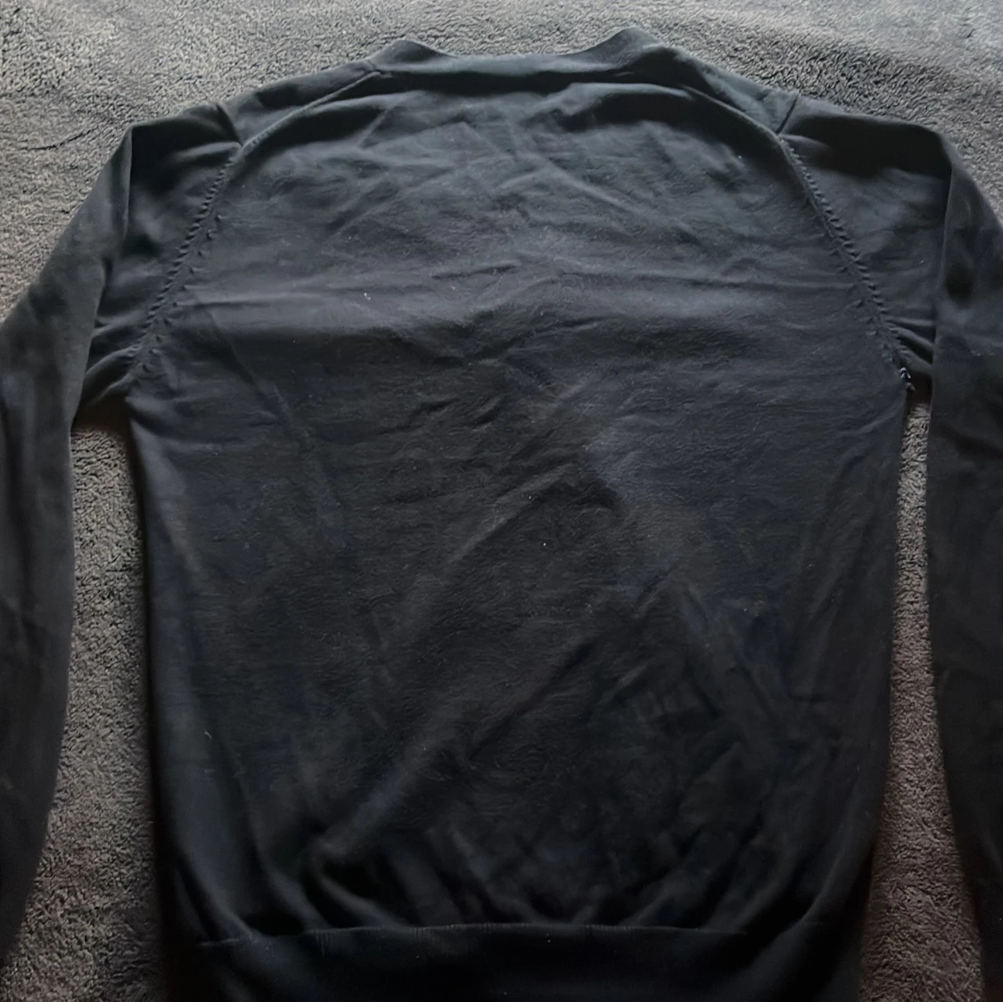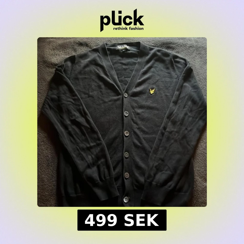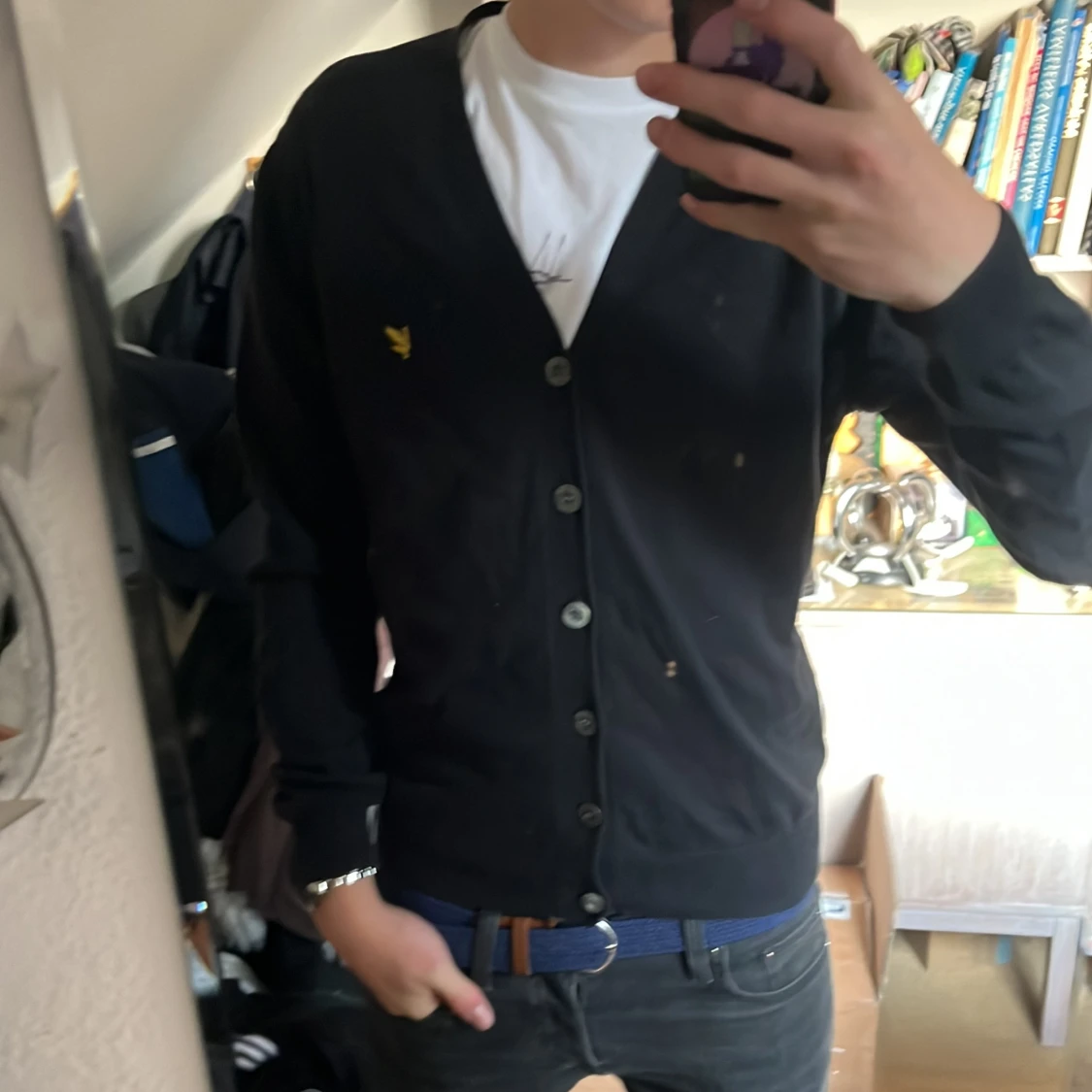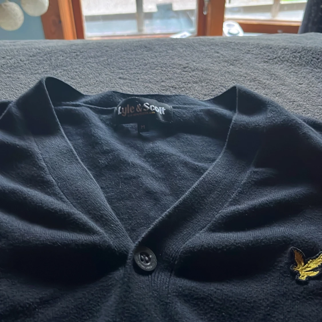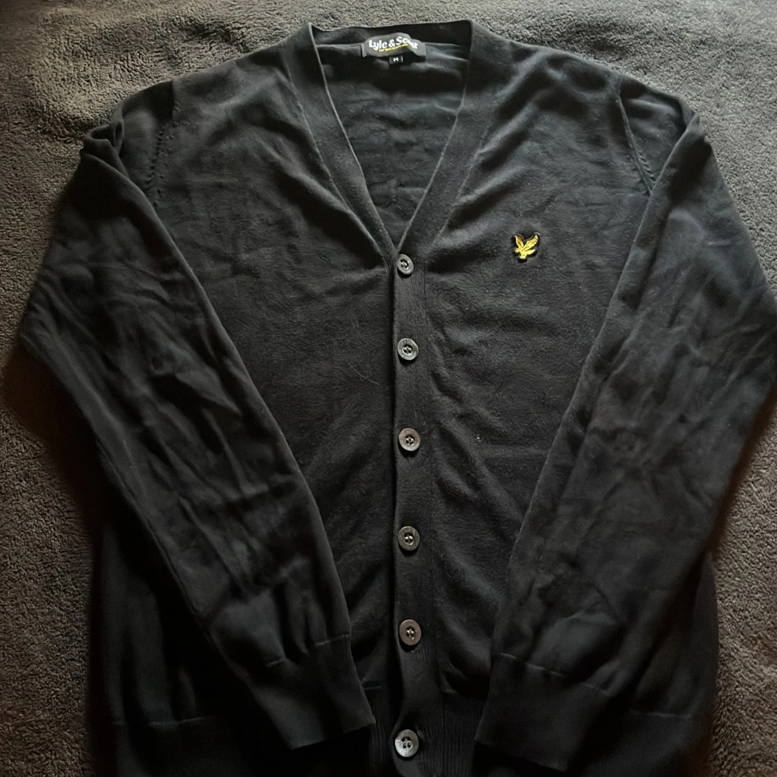 Svart kofta från Lyle & Scott med klassisk v-ringning och knäppning framtill. Broderad gul logga på bröstet. Långärmad och i mjukt material som känns skönt mot huden. Perfekt att slänga över en t-shirt för en clean look.
