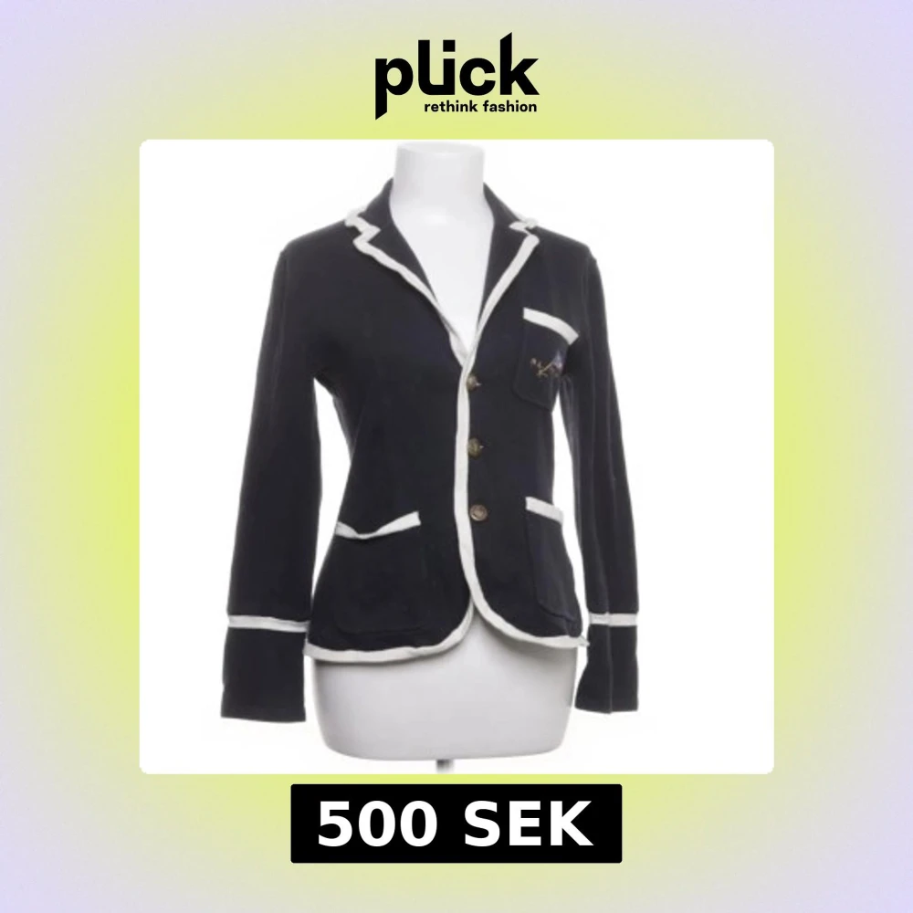 Svart kofta från Ralph Lauren med vit kontrastkant och klassisk krage. Jackan har tre knappar framtill, fickor med vit kant och dekorativa knappar vid ärmslut. Materialet är stickat och ger en mjuk känsla