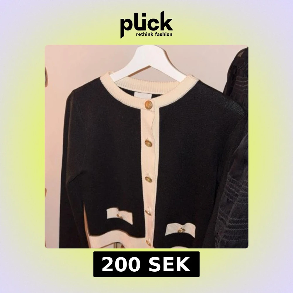 Stilren svart kofta från H&M med kontrasterande vita kanter och dekorativa guldfärgade knappar. Koftan har två små fickor framtill med vita detaljer och är långärmad. Perfekt för att lyfta din outfit med en klassisk touch.