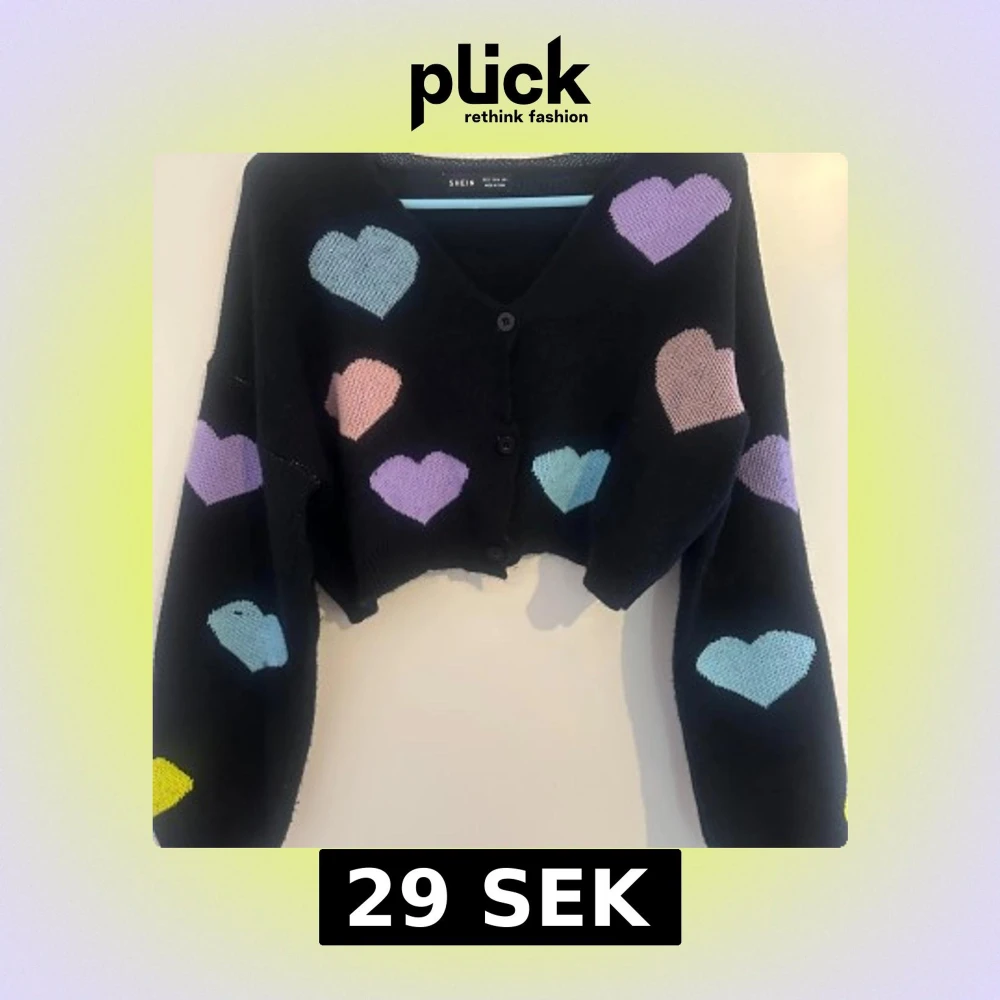 Säljer en svart kofta från Shein med söta hjärtan i rosa och lila. Perfekt för att ge en färgglad touch till din outfit. Koftan har långa ärmar och en bekväm passform.