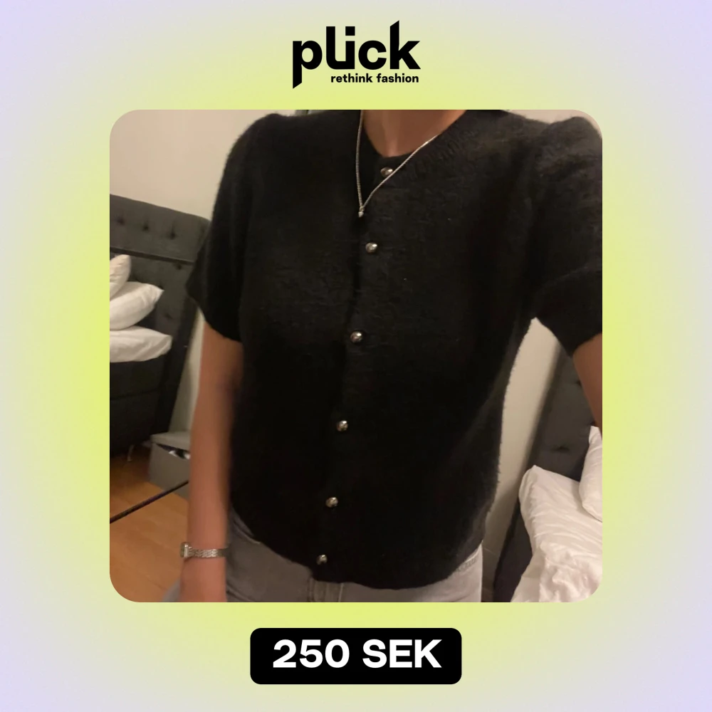 Säljer en svart kofta med korta ärmar och knappar framtill. Storlek L men skulle säga att tröjan är mer som S