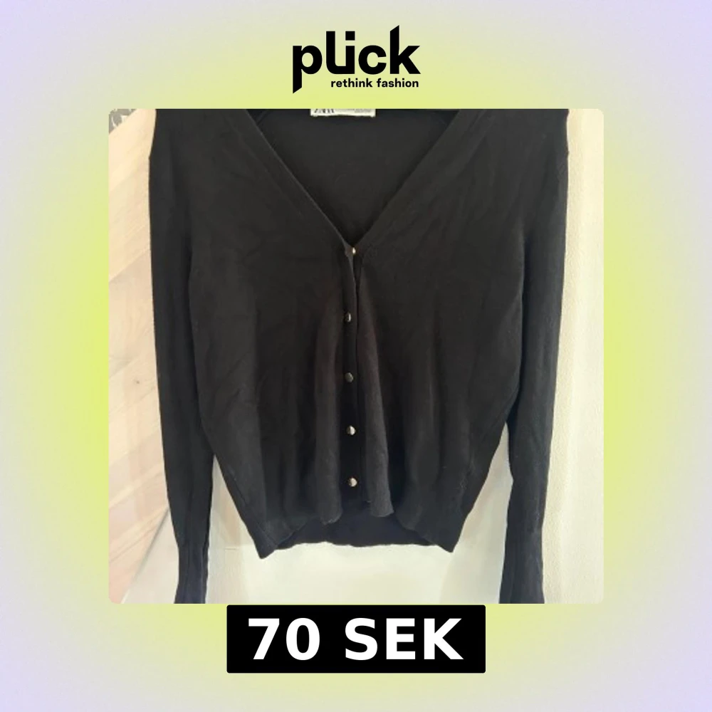 Svart kofta från Zara i storlek M med v-ringning och silvriga knappar framtill. Långärmad modell med smal passform och ribbade muddar. Perfekt att slänga över en topp eller bära stängd för en clean look.