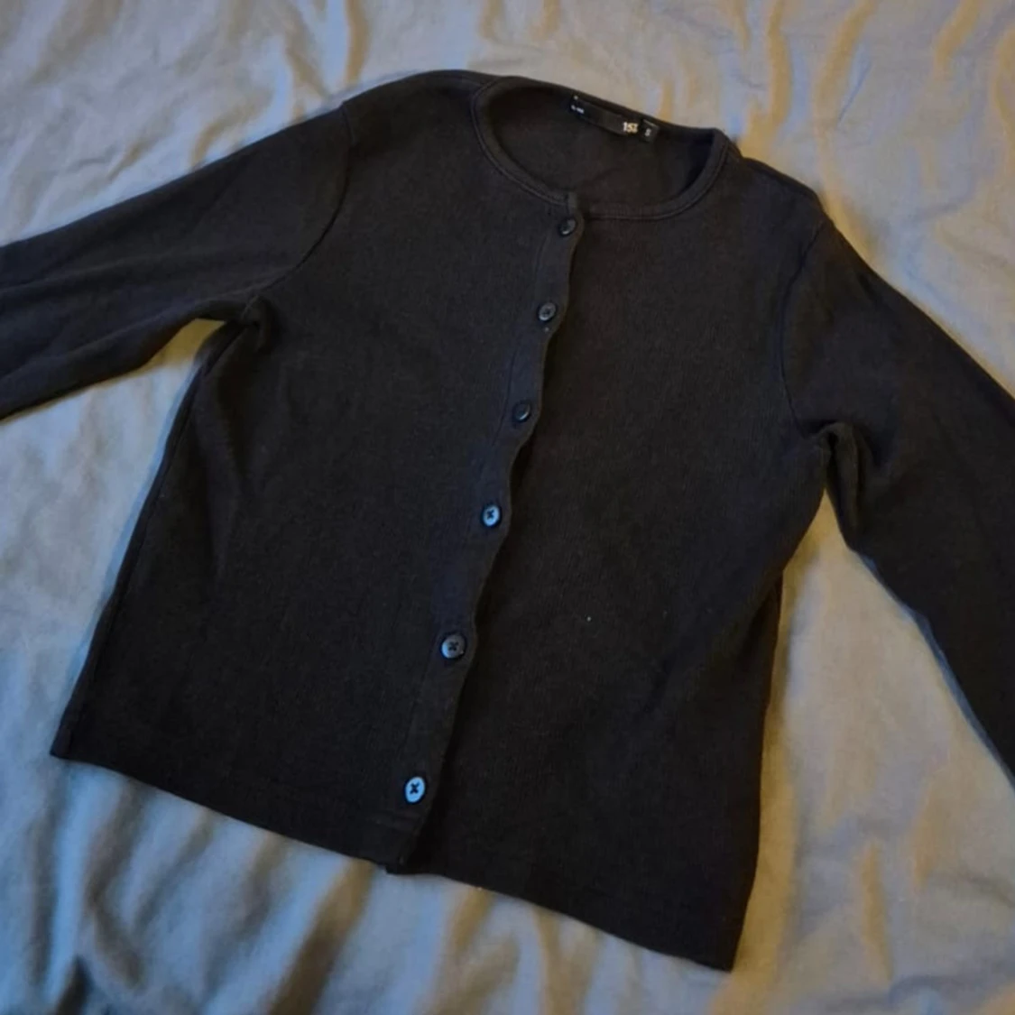 En stilren svart kofta från Lager 157 i storlek XS. Koftan har rund halsringning, långa ärmar och knäppning framtill med svarta knappar. Materialet är mjukt och känns som bomull, perfekt att slänga över en t-shirt eller linne.