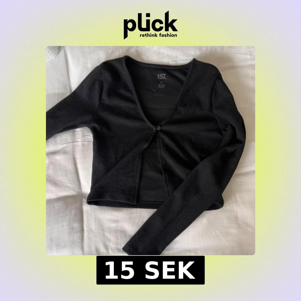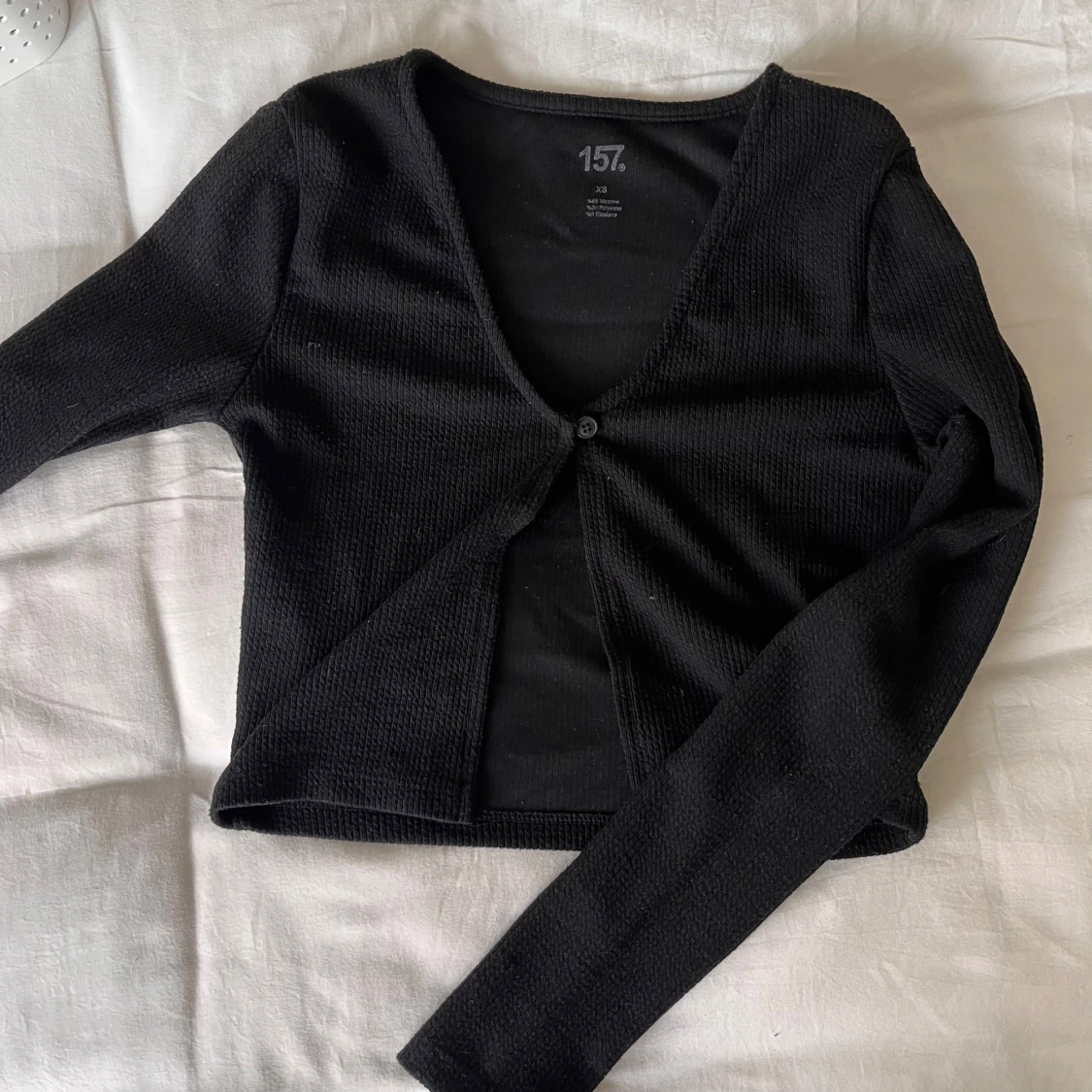 Svart, croppad kofta från 157 med v-ringning och en knapp framtill. Långärmad och i ett väldigt mjukt, ribbat material som är skönt och thight.