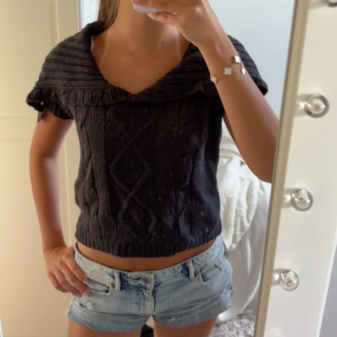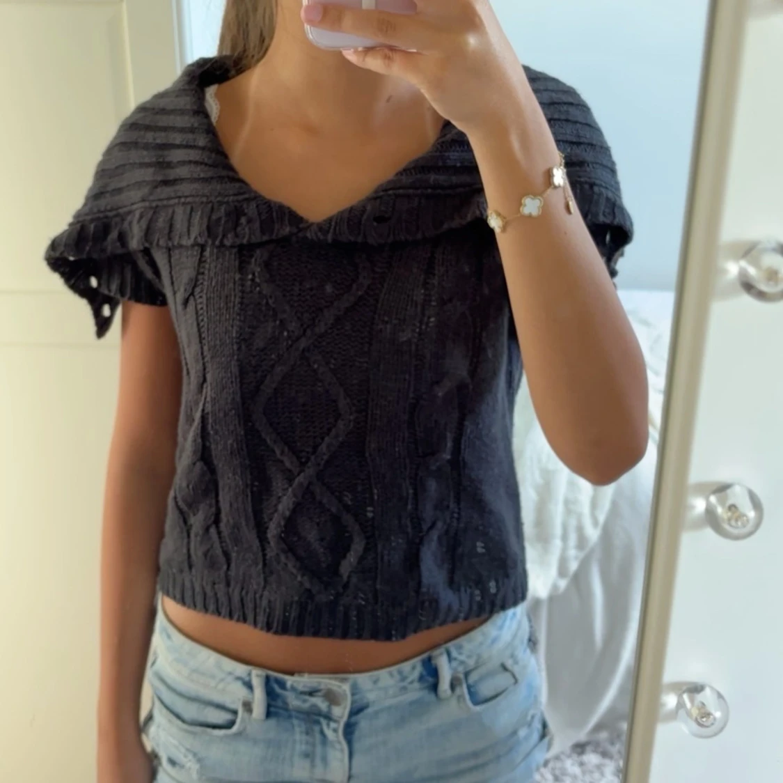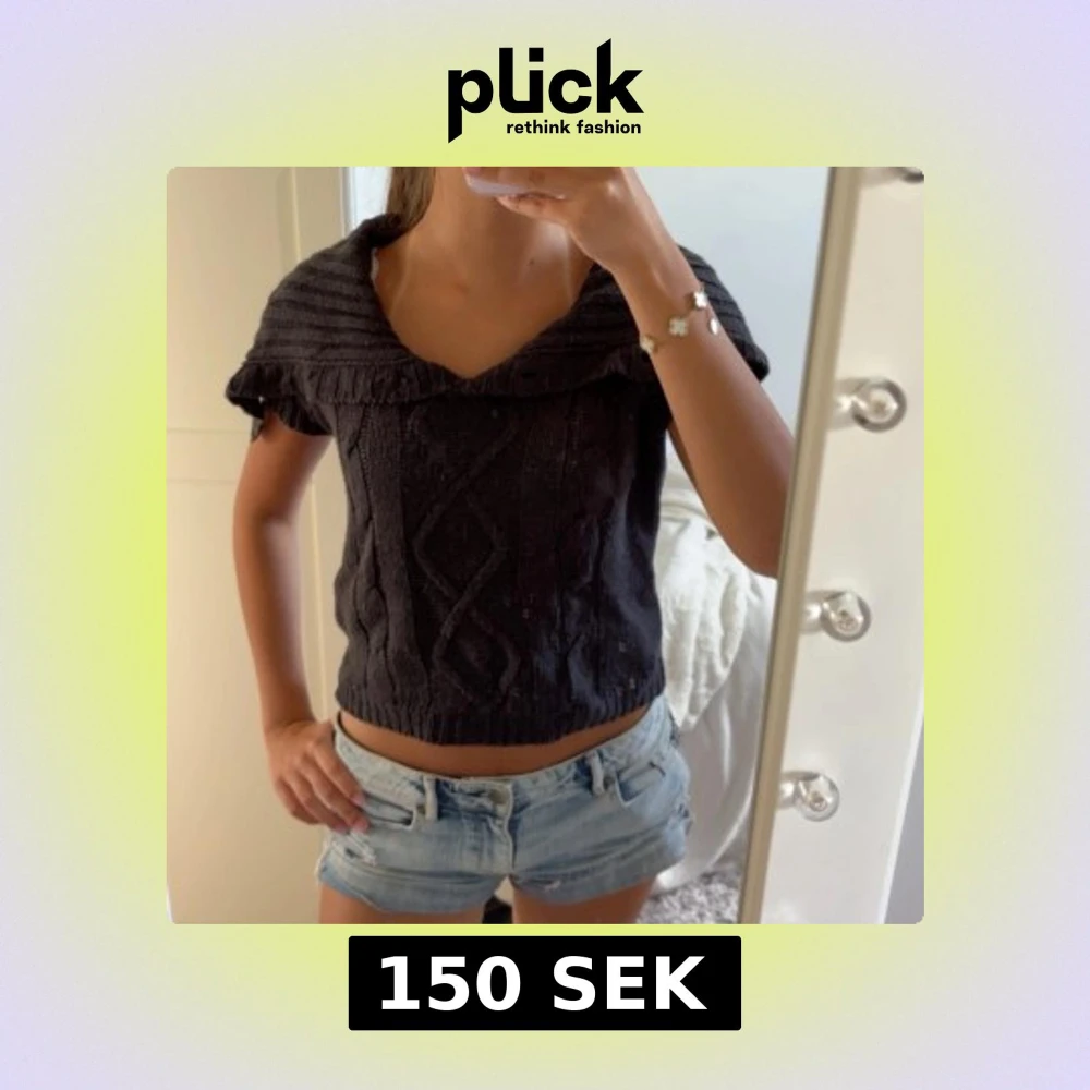 Säljer en super snygg svart stickad tröja med korta ärmar och bred krage. Storleken är M men passar även xs och s❣️
