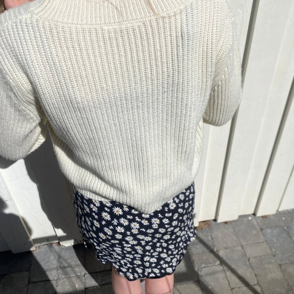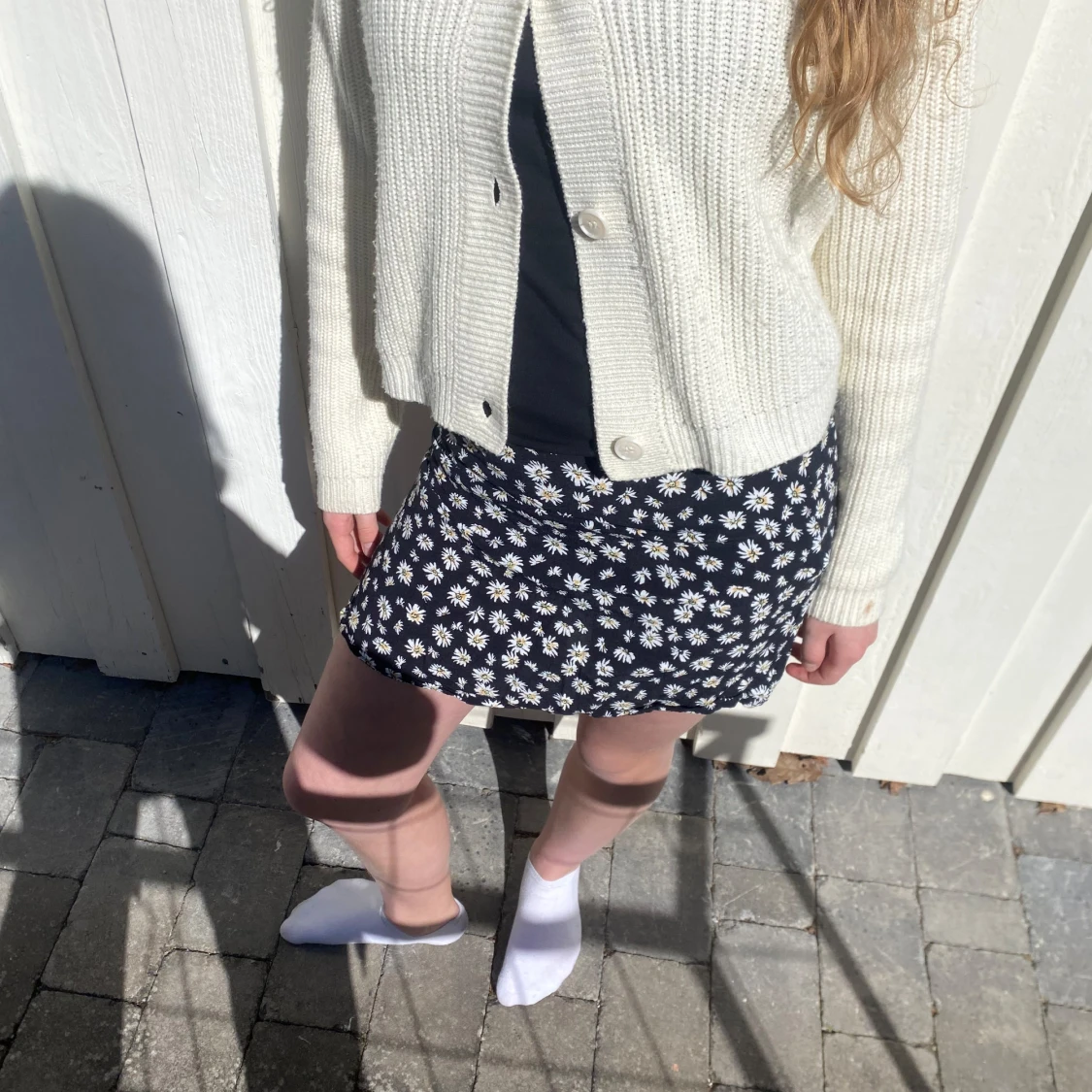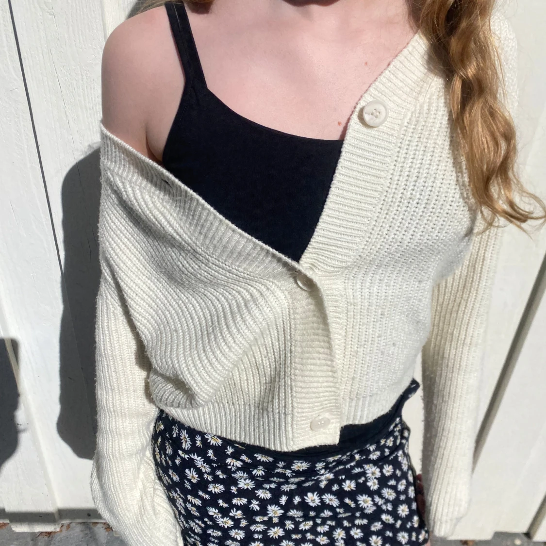 Snygg vit cardigan från KappAhl med ett sött blommönster i vitt. Perfekt för en somrig look. Tröjan har en normal passform och är lätt att matcha med byxor och kjolar. Passar perfekt med kjolen modell på bilden har på och jag säljer.