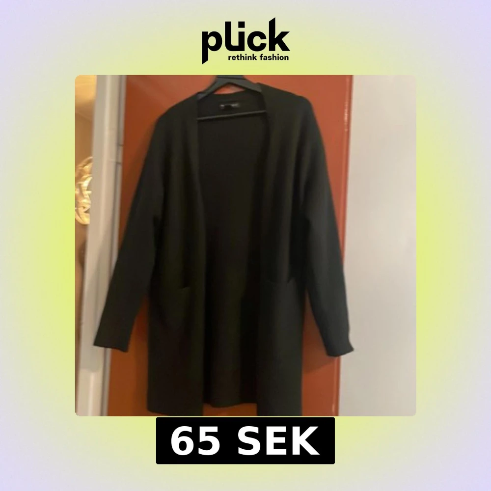 Säljer en svart lång cardigan med öppen front och två fickor framtill. Koftan har lång ärm och en rak, avslappnad passform. Perfekt att slänga över en t-shirt eller tröja för en enkel och stilren look.