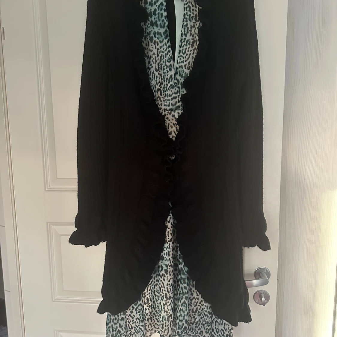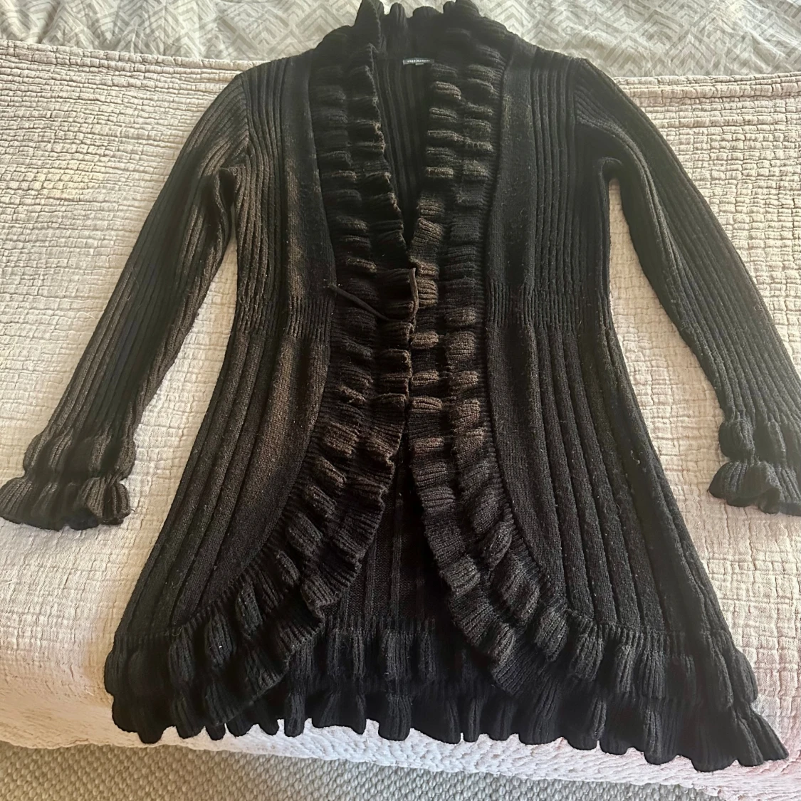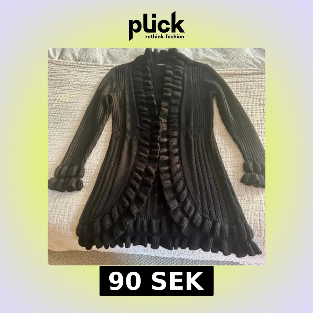 Lång svart kofta från Freequent med snygga volangdetaljer längs kanterna och vid ärmsluten. Koftan är ribbstickad och har en öppen front. Materialmix av akryl, ull och mohair gör den både mjuk och varm. Perfekt att slänga över en outfit för extra stilpoäng.