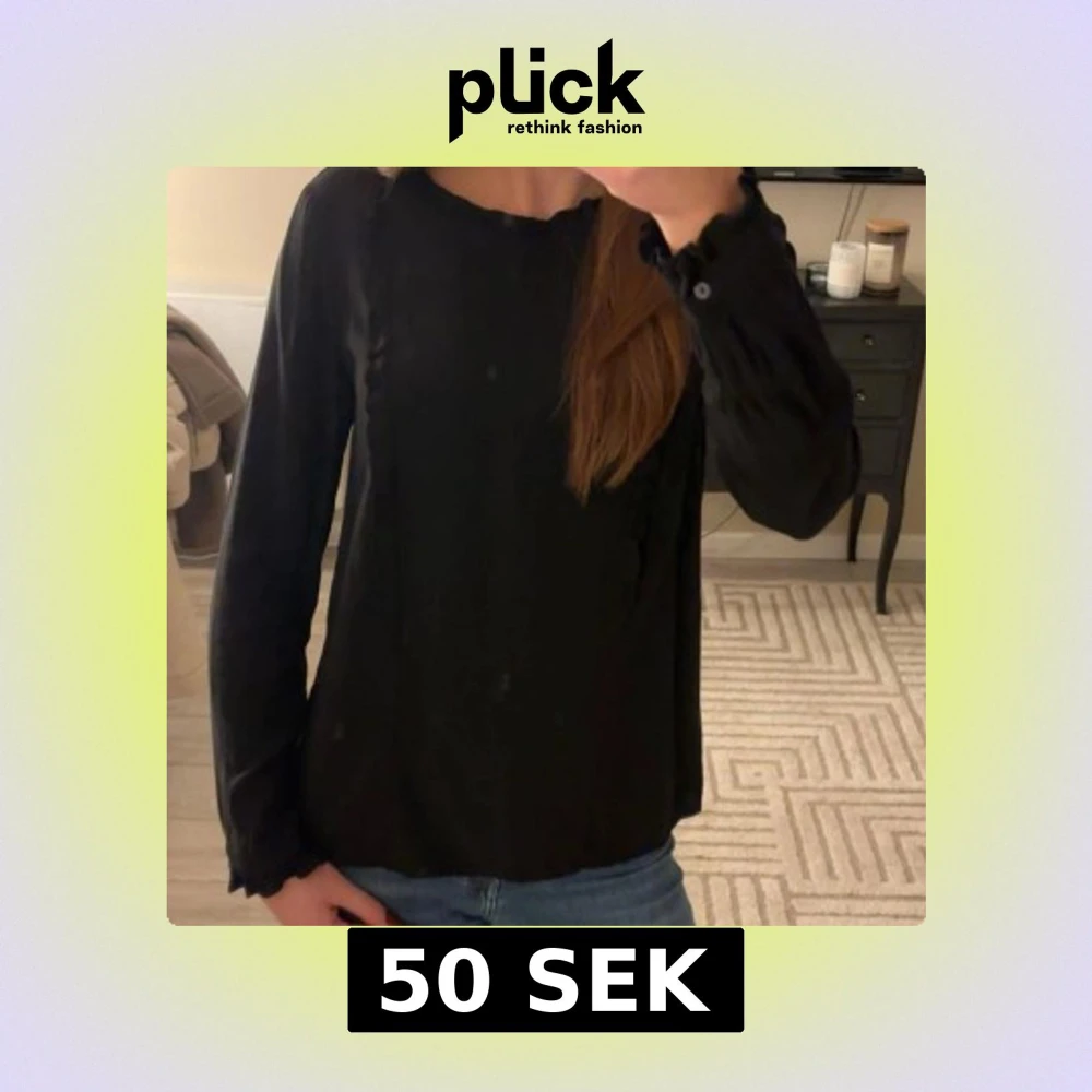Snygg svart blus med långa ärmar och rund hals. Den har även små volang detaljer. Perfekt för en stilren look. Mycket bra skick