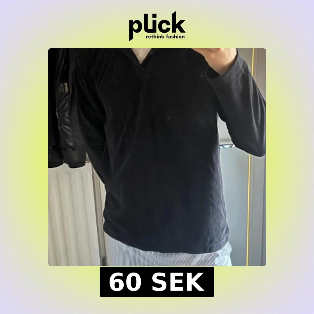 Säljer en stilren svart långärmad tröja med krage. Perfekt för en avslappnad look. Tröjan har en enkel design utan mönster eller detaljer.