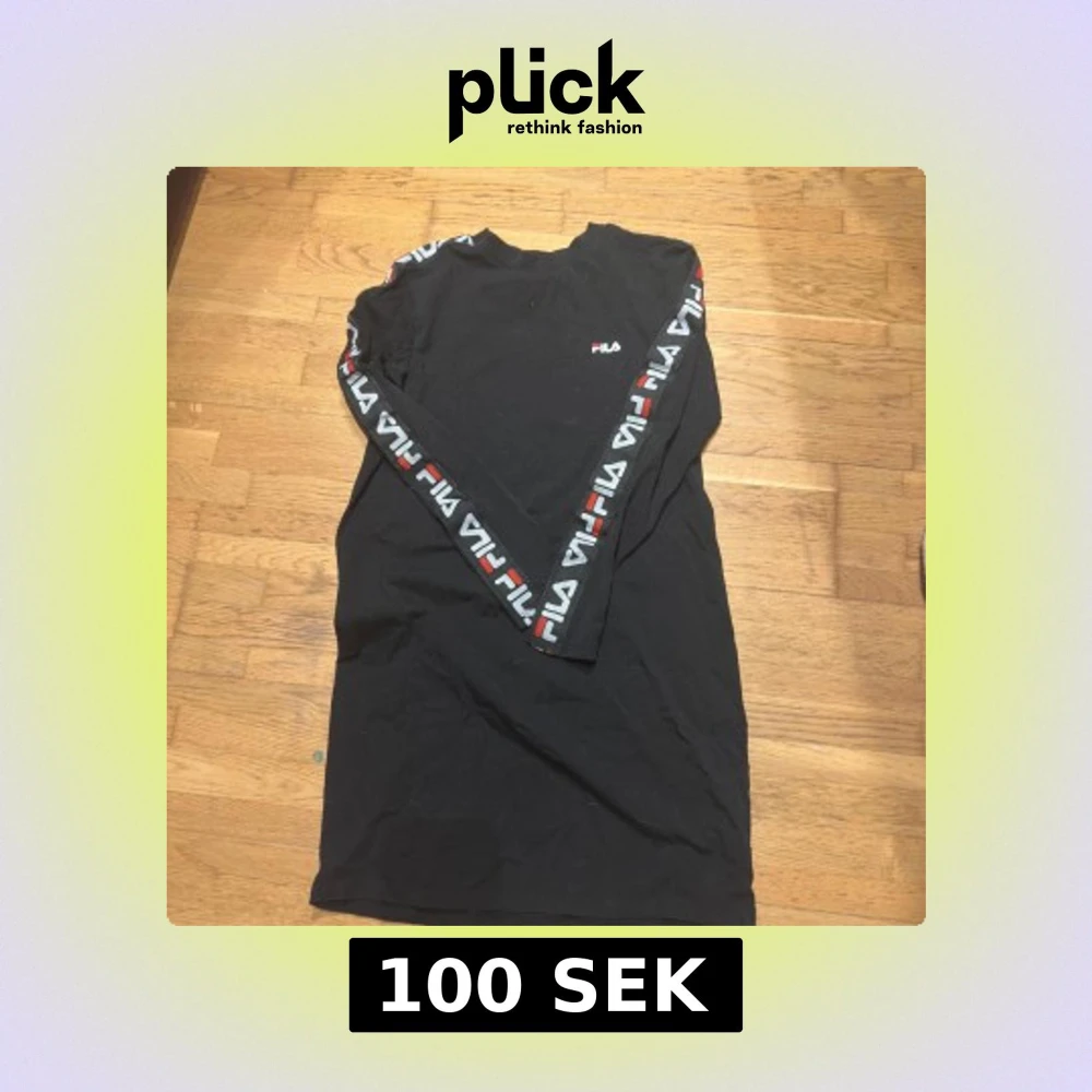 Säljer en svart långärmad klänning från FILA med logotyp längs ärmarna i vitt och rött. Perfekt för en sportig look.